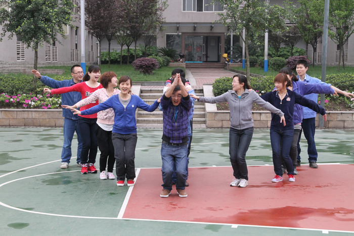 16日上午9:00, 来自重庆片区几家分子公司的40余名团干齐聚运动场,进行最后一项培训科目--拓展培训。由于这他们来自不同的单位,相互之间都不太熟悉,因此在正式分组训练之前,教练先通过一系列的欢快活动,打破了大家的隔阂,建立了相互信任。随后,根据教练的指导,全体人员快速分成了三队,每队分别设计了队名和口号,选出了一个队长。在一段时间的练习之后,进行了不倒森林、十人十一足,运橡皮球、击鼓颠球等6个活动。这几个活动都是需要几个人或者全队人通过默契旁配合,一起协作完成的。当每一队完成自己任务的时候,他们都会情不自禁的欢呼起来,为自己的胜利喝彩。
