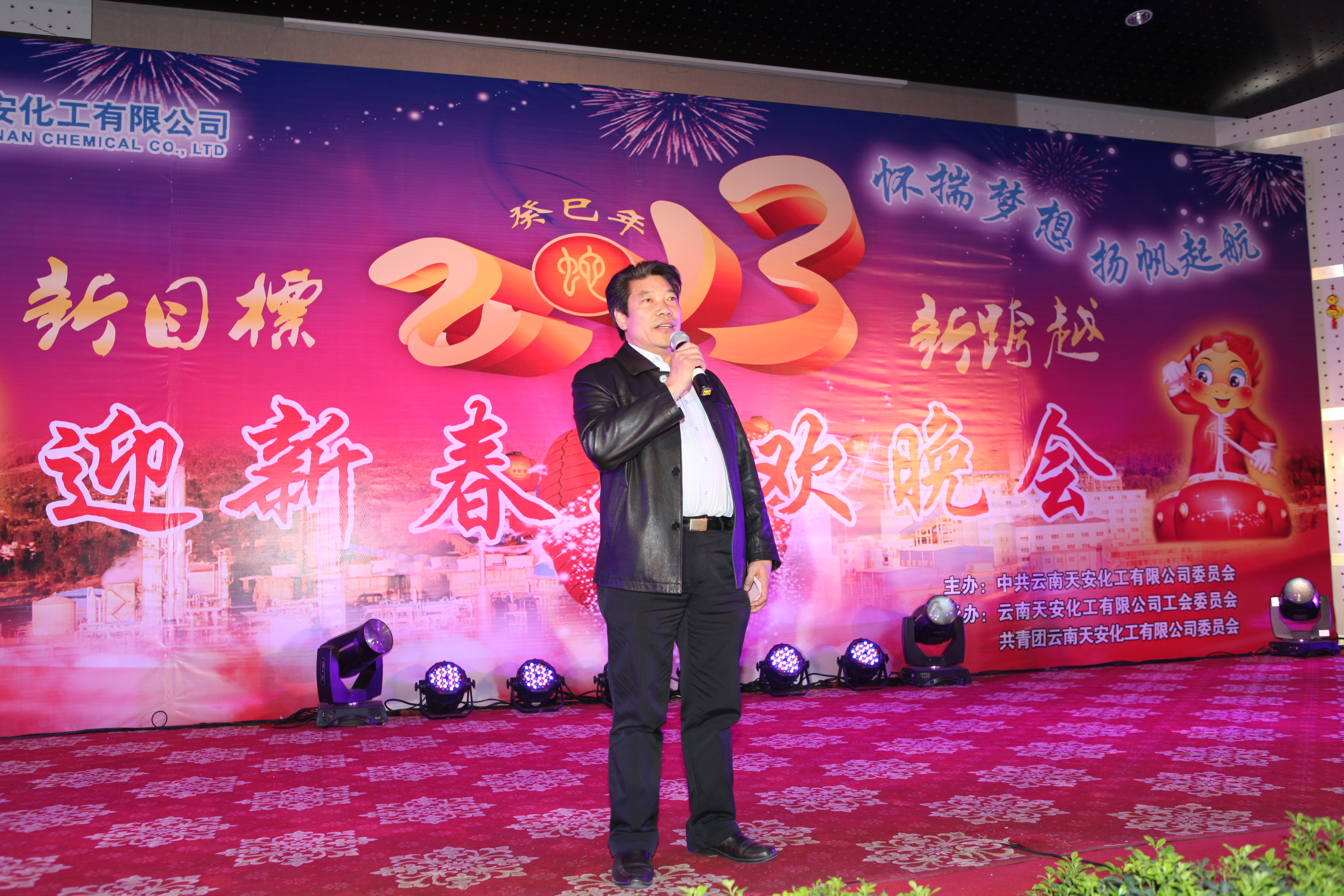 公司总经理罗秀祥同志代表班子成员与大家一同回顾了突破万难、取得的种种不菲成绩的2012年。罗总在热情洋溢的新年致词中说到:2012年是公司发展过程中最不平凡的一年,广大干部职工齐心协力、顽强拚搏,共同抗击了市场的波动、克服装置运行瓶颈,实现了装置投产后的首个“百日红”、 取得了连续运行157天的好成绩、创壳牌煤气化同类装置当期最好运行纪录,实现了装置累计运行325天、运转率89%的新记录;生产合成氨产品48.0117万吨,创投产以来最高产量;实现了装置运行创纪录、产品产量实现新突破、管理实现新跨越的较好成绩。罗总指出,我们将通过加强精细化、精益化、精确化管理,强化煤碳购运控制、装置高负荷运行控制、节能消耗及成本控制、安全环保预防控制、资源有效利用控制等措施的落实,确保2013年目标任务的完成。集团公司工会副主席、云天化股份副董事长、天安公司董事长刘富云同志代表云天化集团、云天化股份和公司董事会也为大家带来了亲切的问候;公司全体班子成员上台向全体员工拜年,致以新春的问候和诚挚的祝福,并向现场观众送出了精美的小礼品,让整场晚会一开幕便掀起高潮。