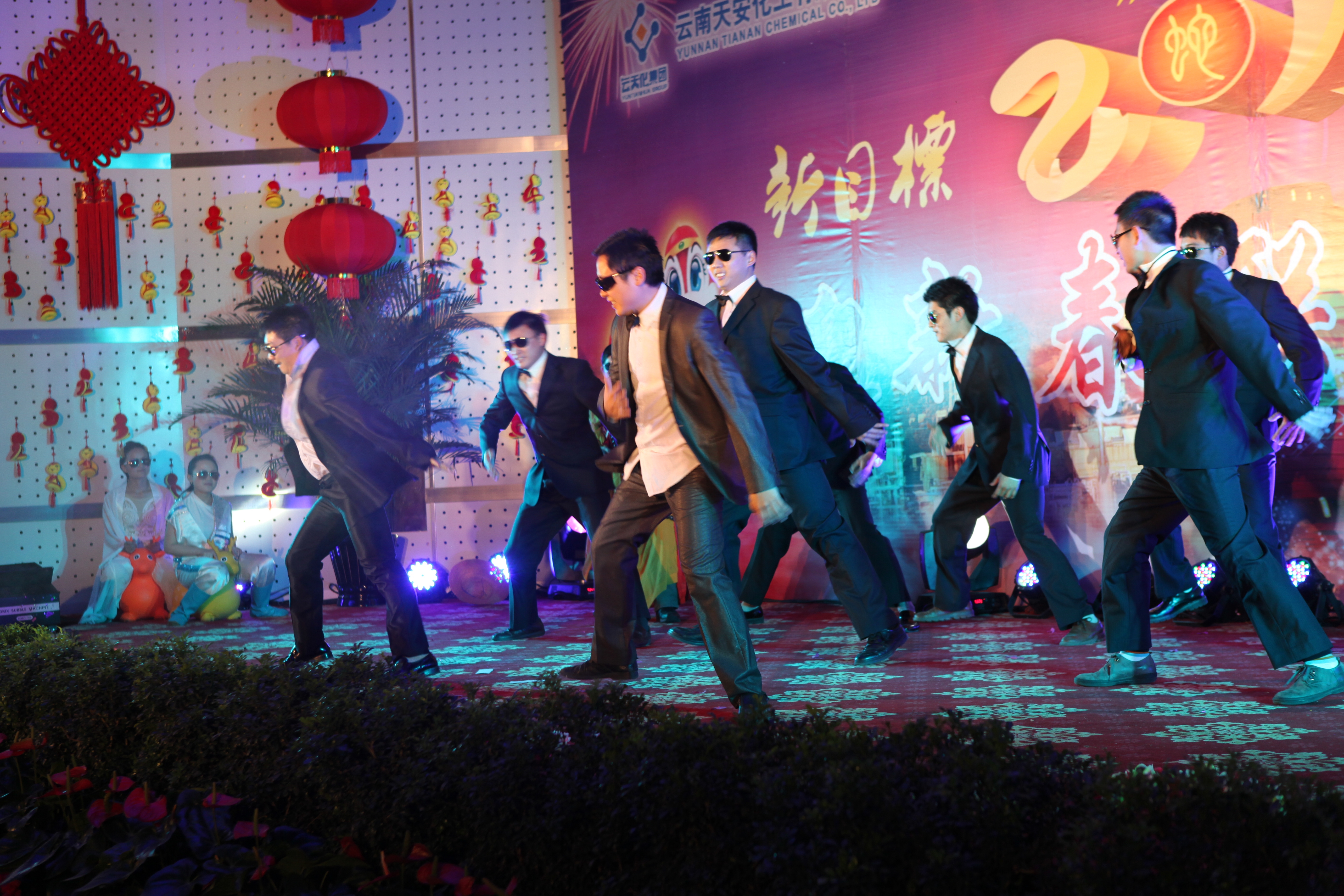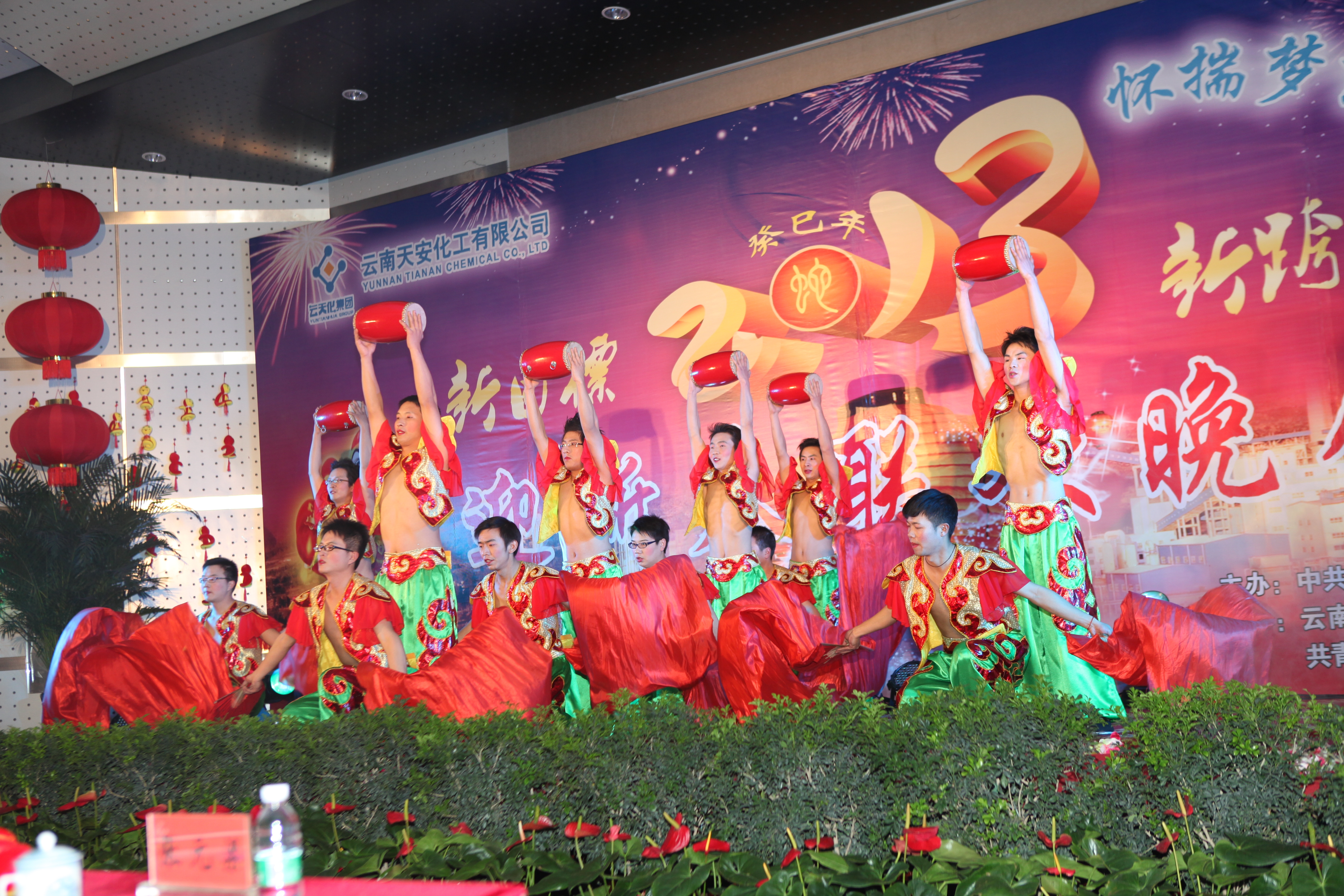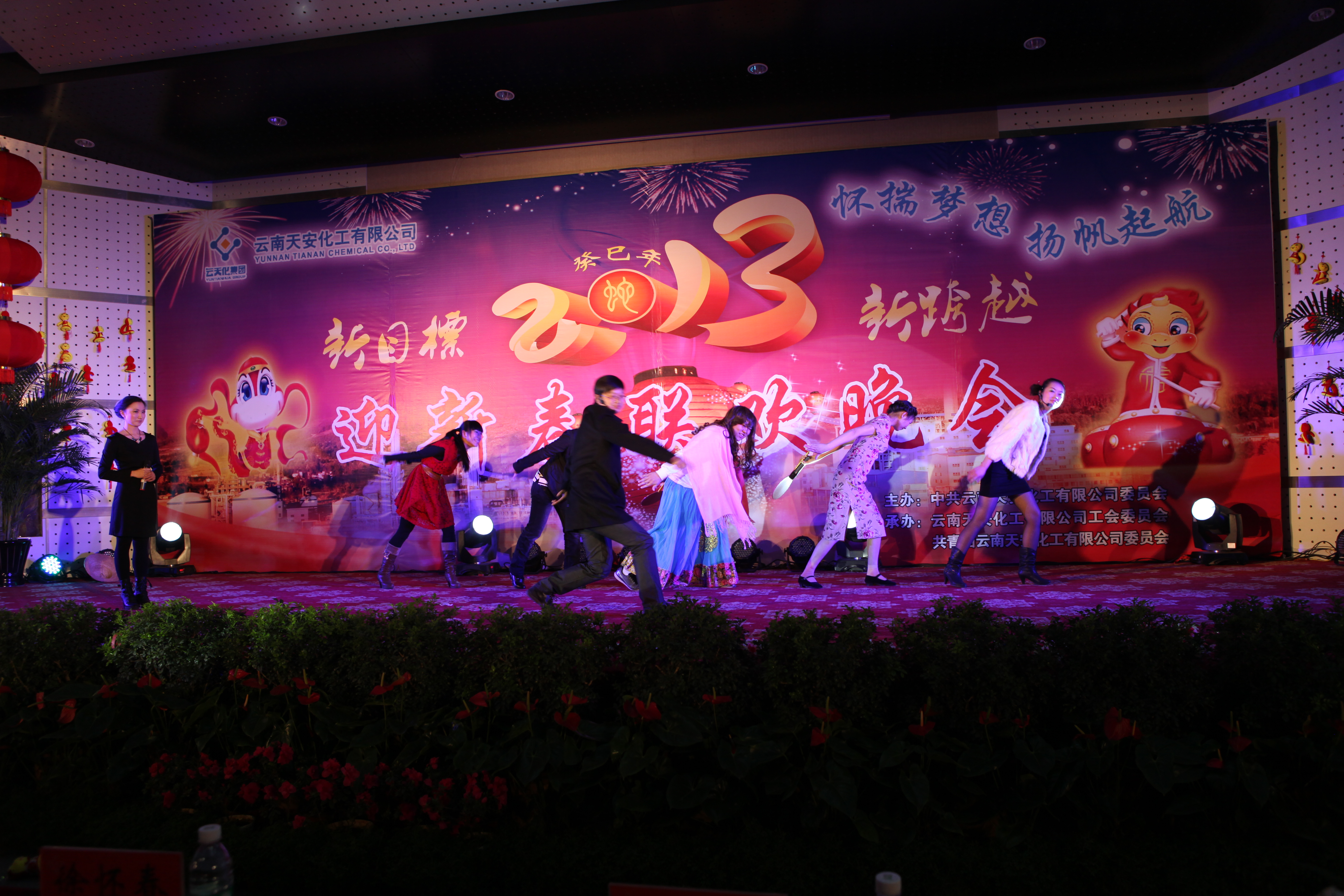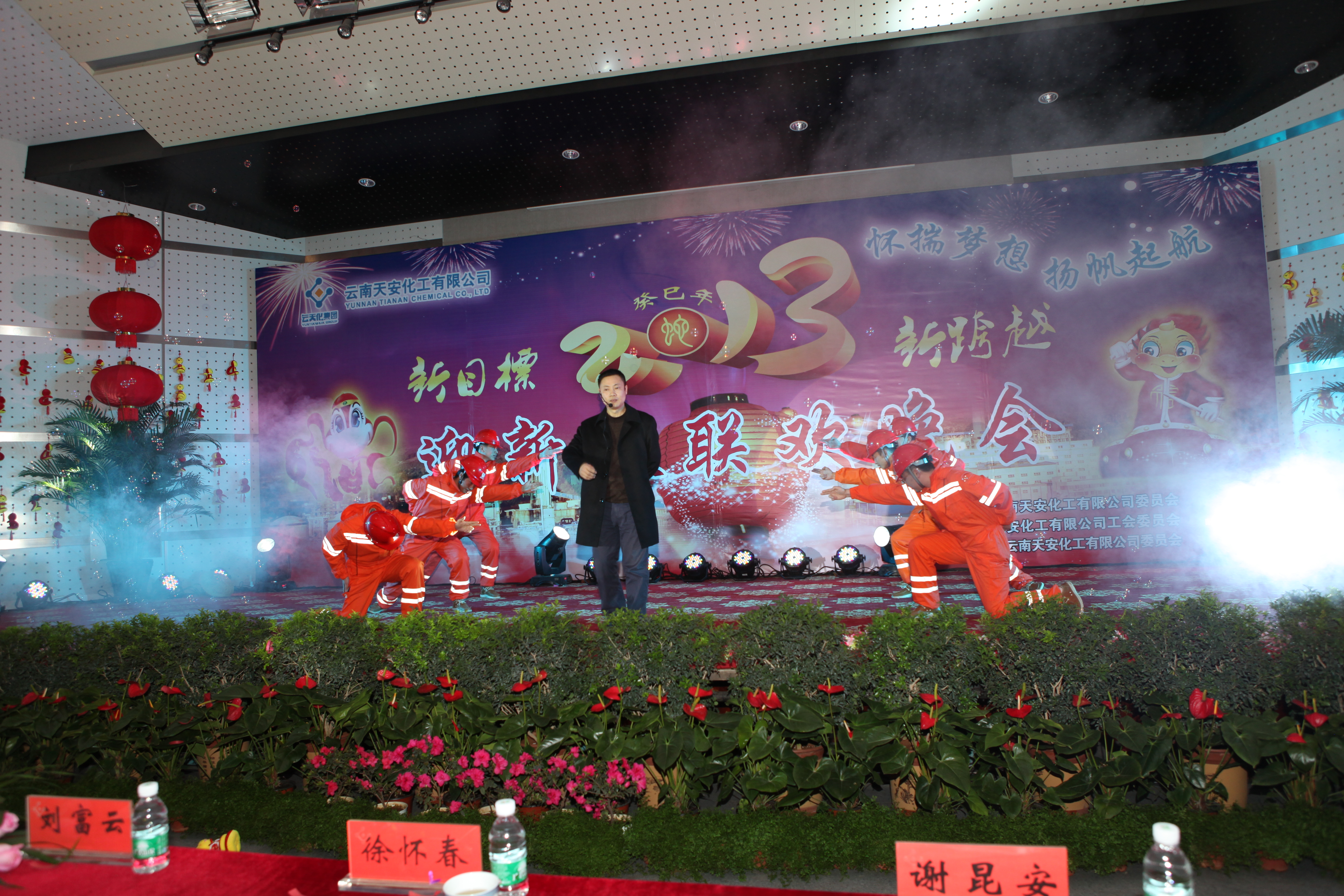 踏着丰收的歌声,敲起响亮的锣鼓,跳起欢快的舞步,检修车间充满朝气与热情的小伙子们用跃动的色彩和雀跃的舞姿用《欢聚一堂》将晚会的序幕正式拉开;随后,来自中心化验室小姑娘们用精心编排的《吉祥颂》为公司送来了蛇年最好的祝福;电仪车间诙谐幽默的小品《天天向上》穿插着时下最流行的“骑马舞”引得观众们哈哈大笑;行政工会与经营工会联袂献上了清新的男女生对唱《另一个天堂》;生产工会由副总工程师刘开宇亲自上阵,带领6位青年才俊为大家献上了“一本正经”的诙谐舞蹈《天安六神》;热电原料工会的俊男美女们再次拿出看家本领,上演了当下青年们最关注的大型相亲节目《非你勿扰》,节目编排幽默、题材和主角贴近身边的同事,引来现场阵阵爆笑和热烈的掌声;合成车间和制气车间分别献上了优美的舞蹈《好运来》和诗朗诵《天安记忆》,深情讴歌了天安人的风姿风采,送上了对公司以及在场所有观众的真诚祝福;公司团委也献上了极具时代感和现实意义的舞台剧《天安保卫战》,晚会在公司工会的歌舞《相信》中推向了最高潮,在《云天化之歌》中落下帷幕。