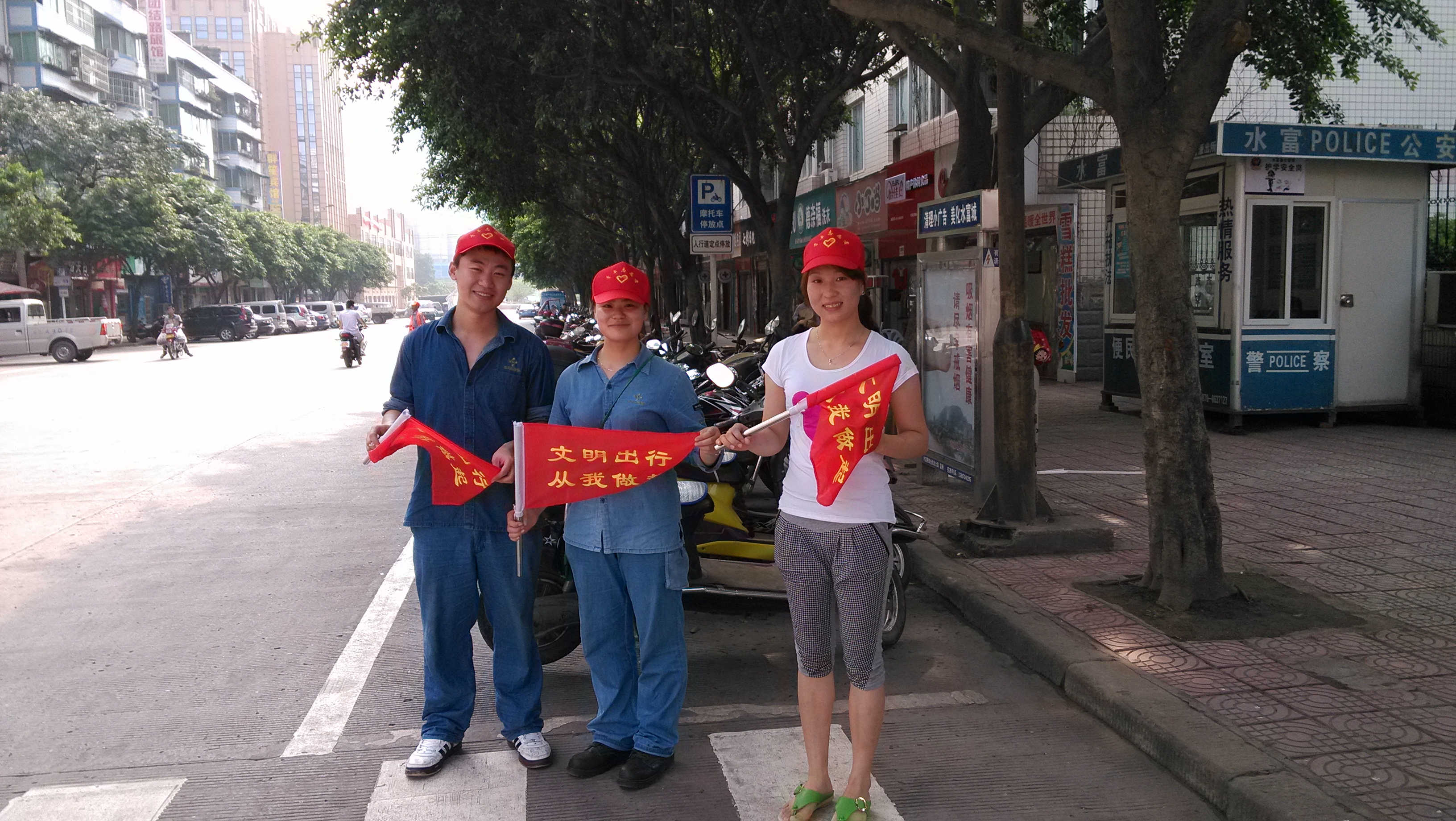 在公司员工和云天化中学放学的高峰期,我们随处可见一批统一佩戴红色青年志愿者帽子的志愿者,正手持着一面印有“文明出行、从我做起”的红色旗帜不时的劝导着一些过马路不走斑马线、未按标识牌停放车辆等不文明现象。公司的青年志愿者们用良好的精神风貌为水富县创建云南省省级文明县城和创建全国卫生县城贡献着力量。