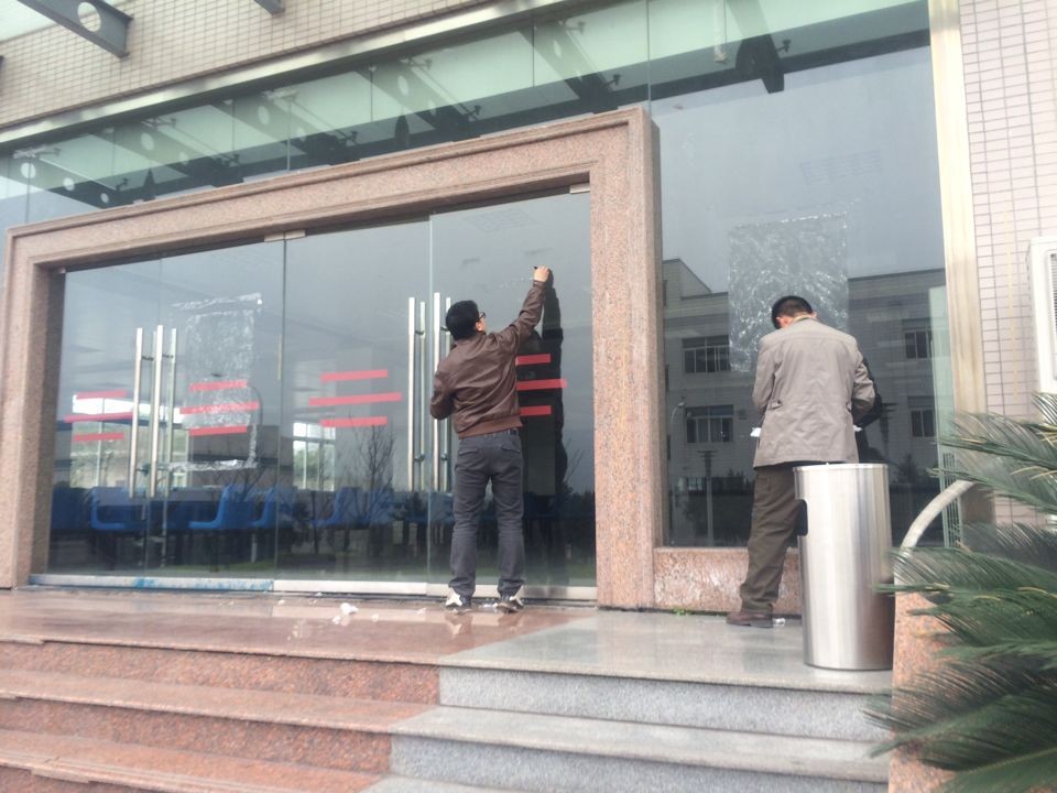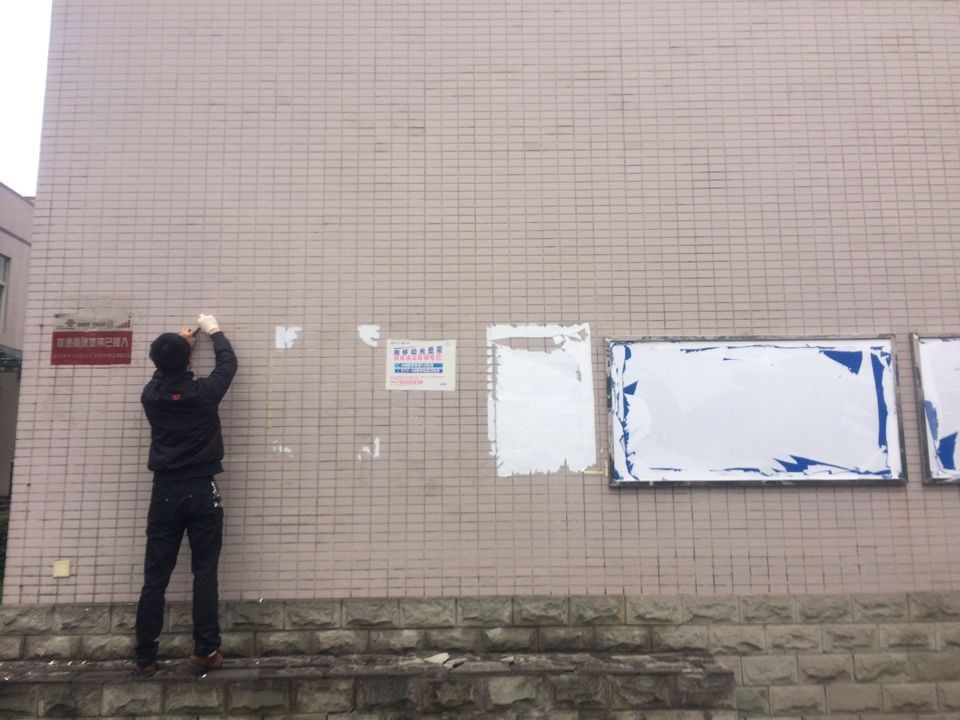 电子材料工厂团支部负责清除干净食堂和宿舍楼下的小广告,细小的刀片握在手中,趴在墙上不停的劳动着。他们不畏困难艰辛为园区服务仍是雷锋精神的真谛。