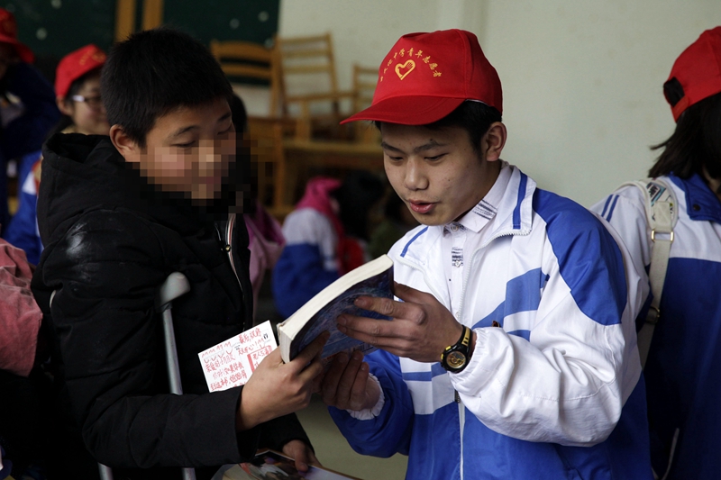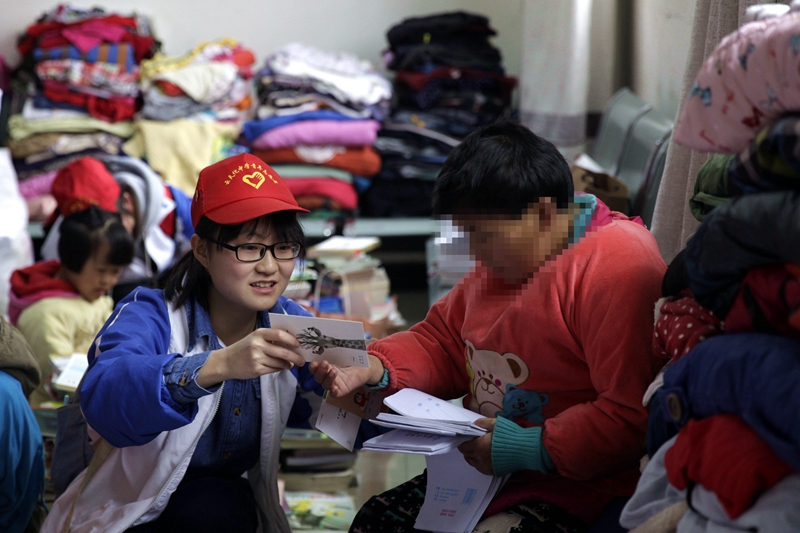 志愿者向小朋友赠送明信片