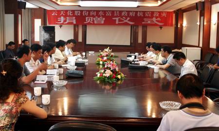 公司总经理刘和兴首先做了讲话,对地震灾区的群众和死难同胞表示同情和深切哀悼,并介绍了地震灾害后云天化集团及各分、子公司向灾区的捐赠情况。刘和兴指出,公司长期以来的发展离不开地方各级政府的大力支持,在自然灾害面前,企业也有不可推卸的责任。在得知水富县及周边地区遭受重大损失后,公司决定向灾区捐款256万元,其中200万由集团公司转交汶川灾区,56万用来援助水富县及周边受灾群众,以帮助灾区尽快恢复生产,重建家园。