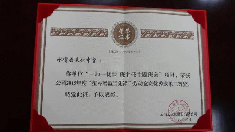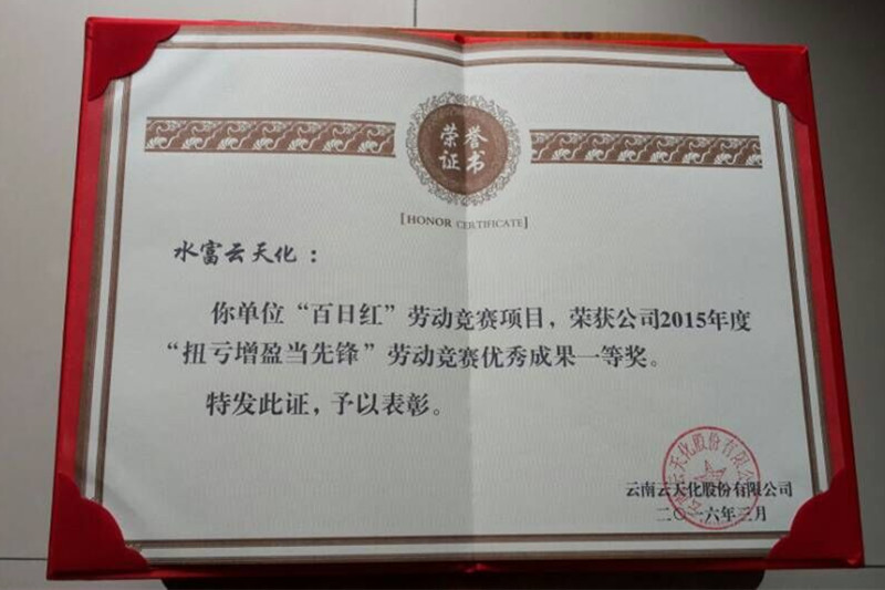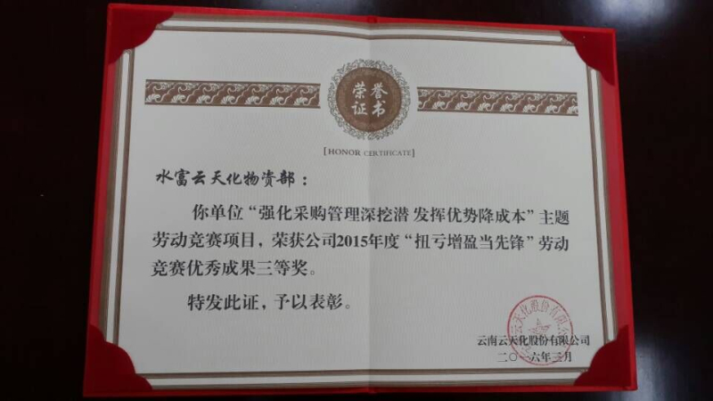 富有成效的工作受到了上级工会的认可。在此次表彰中,水富云天化荣获2015年“扭亏增盈当先锋劳动竞赛杰出团队”称号,水富云天化工会荣获2015年“扭亏增盈当先锋劳动竞赛优秀组织奖”;公司本部“百日红”劳动竞赛获“优秀成果一等奖”;云天化中学“一师一优课 班主任主题班会”和原聚甲醛车间“建功在企业 和谐促发展”两个劳动竞赛项目获“优秀成果二等奖”;成运部“改变发运模式 降低运输成本”、物资部“强化采购管理深挖掘 发挥优势降成本” 劳动竞赛项目获“获优秀成果三等奖”。