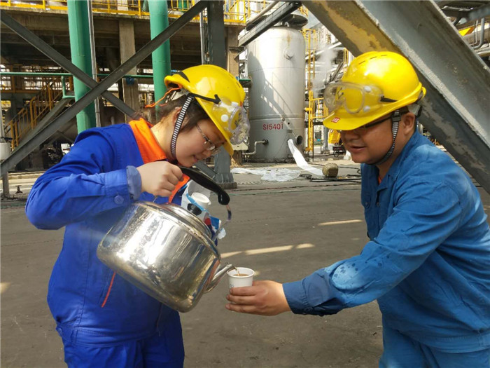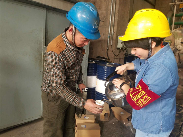 为了让大修现场一直作业的检修人员喝上一口茶水,女工服务队员们每天早早的便到达现场,清洗水壶、清点纸杯、准备开水、冲泡茶叶,然后拎着沉重的水壶爬高上梯,为大修现场的作业人员送上茶。“师傅,您辛苦了,请喝水”,一句真挚的问候,让作业人员在劳累之余,感受到了不一样的温暖。