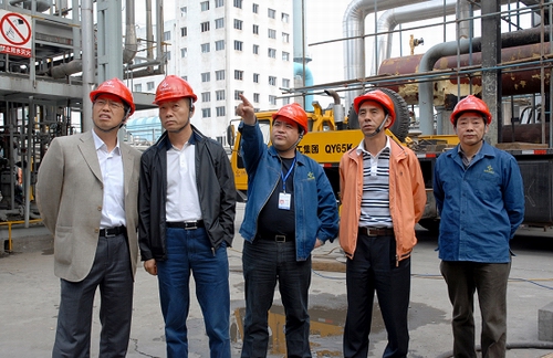 3月30日,在合成氨装置抢修工作正紧张进行时,心系生产的集团公司总经理他盛华、副总经理吕庆胜、总工程师凌晓东、副总工程师杨晓辉等一行亲临公司,就装置抢修、设备修复等工作进行了视察。