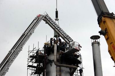 晚上7:30,当记者再次来到触媒填装现场时,却看到了另一番不同的景象。此时,天上已下起了蒙蒙的细雨,经过2个小时的紧张工作,触媒填装工作结束了,但合成塔上忙碌依旧,为了不影响检修进度,天鸿检修人员正在抓紧时间进行触煤盖板的回装工作。