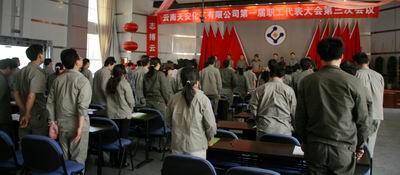 下午,与会代表还围绕工作报告从生产管理、设备管理、安全管理、质量管理、挖潜增效、队伍建设等方面进行了分组讨论,并针对公司生产经营中存在的问题和不足以及急需处理的一些问题提出了意见和建议。最后,大会审议通过了公司工作报告和《公司工会关于建议公司实行“四班两倒”工作制的提案》,并形成了两个决议。大会在高亢的国际歌中胜利闭幕。