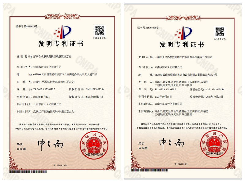近日,公司自主研发的“一种用于供热装置的锅炉智能给煤系统及其工作方法”与“尿素合成系统置换管线及置换方法”两项技术,成功通过国家知识产权局审查,获发明专利授权。截至目前,年内公司已累计实现19项专利技术授权,较去年全年增长27%,创新成果呈现“量质齐升”的发展态势。