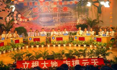 为热烈庆祝云天化建企30周年,由集团公司党委主办、云天化股份公司党委承办的“辉煌三十年”知识竞赛电视抢答赛于9月16日晚在电视演播厅隆重举行。云天化股份、盐化股份等六支队伍参加了竞赛,经过激烈角逐,云天化股份夺取竞赛桂冠。