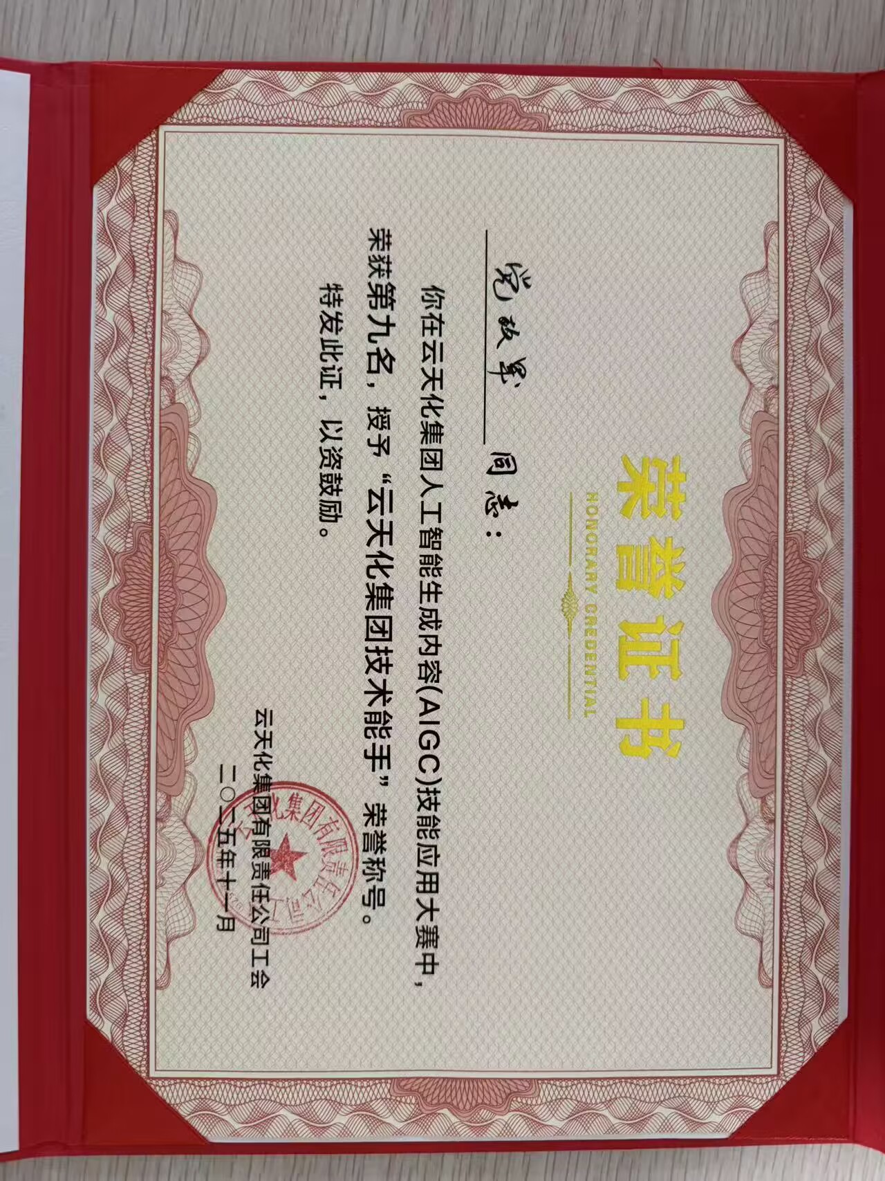 在近日落幕的云天化集团人工智能生成内容(AIGC)技能应用大赛中,公司2025年新入职员工党政军凭借扎实的专业功底与出色的实操能力,荣获大赛第九名,被授予“集团技术能手”称号。