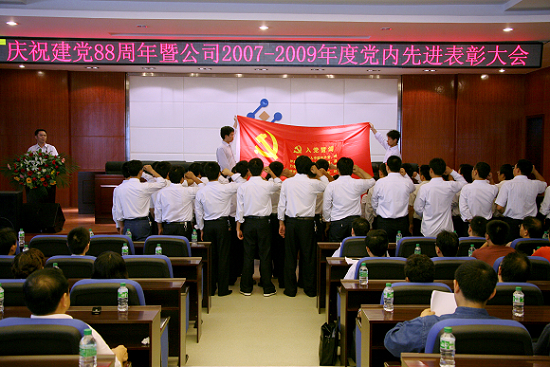 经过近两天的党内交流评比后,7月1日下午,公司在工会会议厅隆重召开纪念中国共产党诞辰88周年暨2007--2009年度党内先进表彰大会,大会对前期评出的30名优秀共产党员、10个先进基层党组织、16个党建和思想工作创新成果进行了表彰。