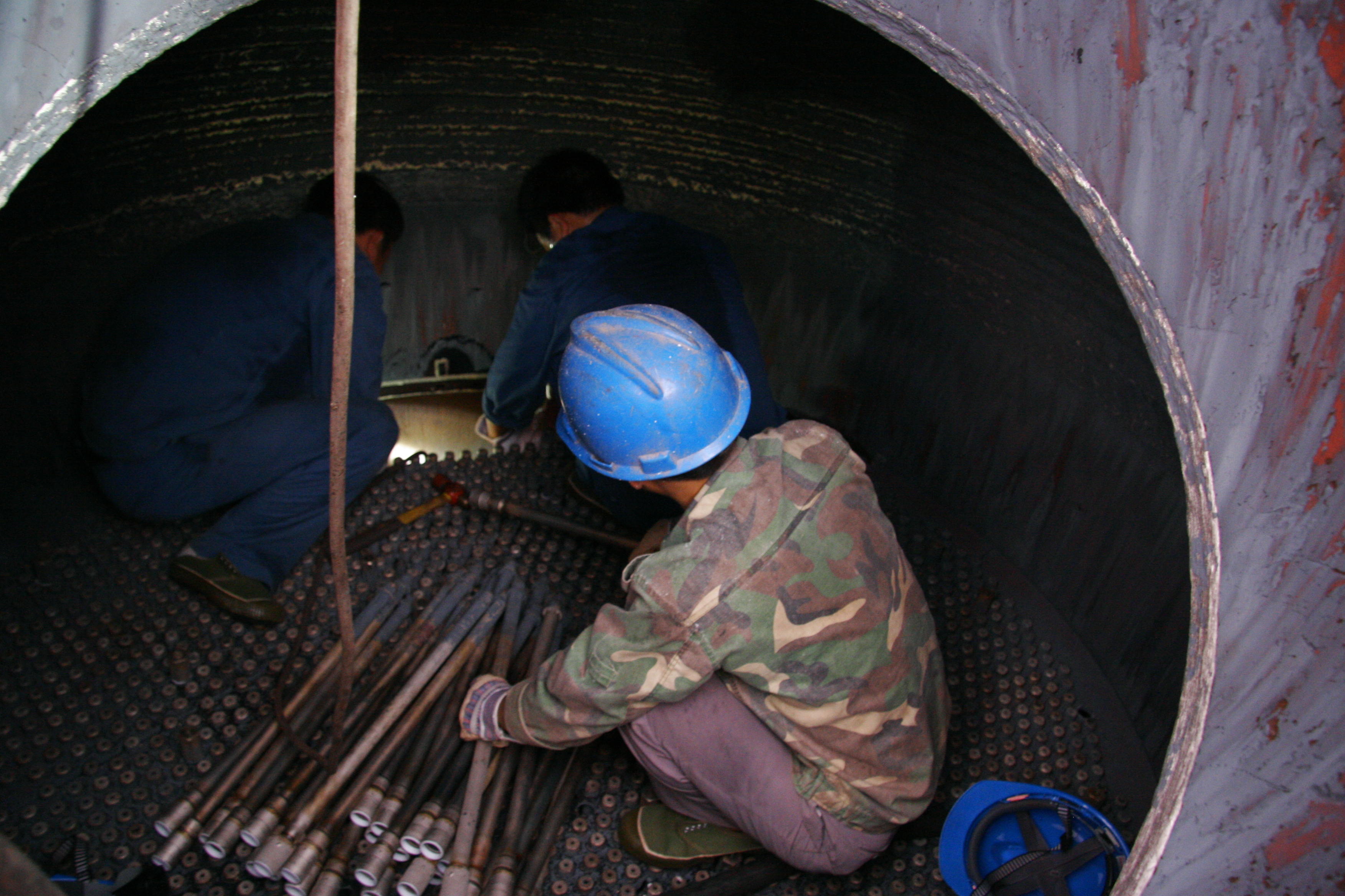 机械厂接到抢修任务后随即开始制定抢修计划并协调各方人员。为了以最短时间将设备抢修好,27日晚,各路检修人员从工艺手中接过抢修项目后,立即进场展开了这场检修攻坚战。在狭小的空间内,面对数千的管程,抢修人员冒着50多度的高温,与工艺技术人员一起同心协力,拆封头、查漏点、议方案,昼夜兼程地查找漏点进行抢修。
