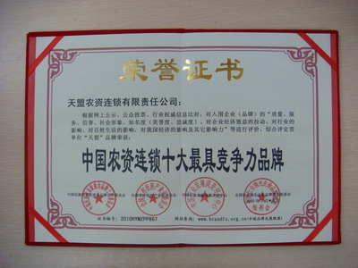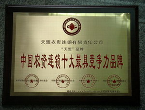 经过组委会严格筛选,2010年1月,天盟公司的“天盟”品牌荣获“中国农资连锁十大最具竞争力品牌”和“中国农资连锁十大满意品牌”两项殊荣,在受到经济危机严重冲击下,这两项大奖来之不易,是公司多年来默默耕耘的回报。