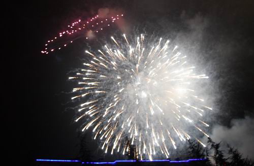 焰火晚会的高潮是“前程似锦”,在这组烟花中,灿烂多姿的各种“花卉”同时在高低空绽放,五光十色,瑰丽无比,让人玄目陶醉!接下来,最具技术含量的“笑脸” 烟花在夜空中以立体感笑脸绽放,让人们发出阵阵惊喜的尖叫。看着焰火在空中呈现出的万紫千红景象,看着那一颗颗流星乍时爆裂出美丽的花朵,此刻,在场的人们忘记了寒冷,忘记了脖子的酸痛,思绪万千早已进入到了美丽的画卷……