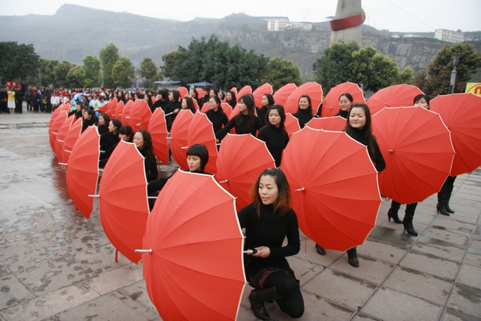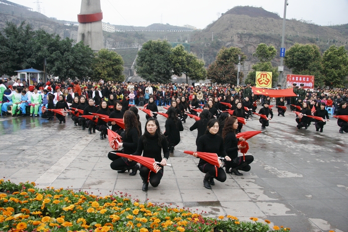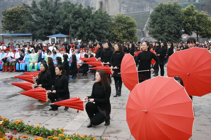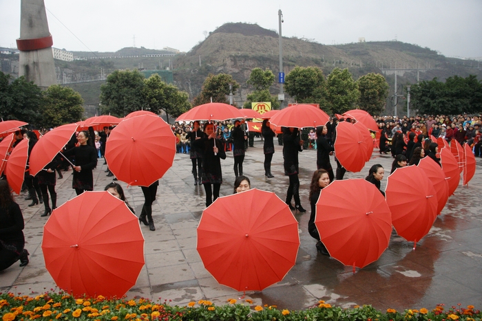 16:10,游行结束。所有的游行队伍聚集在水富春晖广场进行文艺表演。公司女工方队手握红色雨伞,在充满激情的旋律中,张弛有序的雨伞配合不断变换的队形,鲜艳的颜色配搭上优美的舞姿赢得观众阵阵掌声。