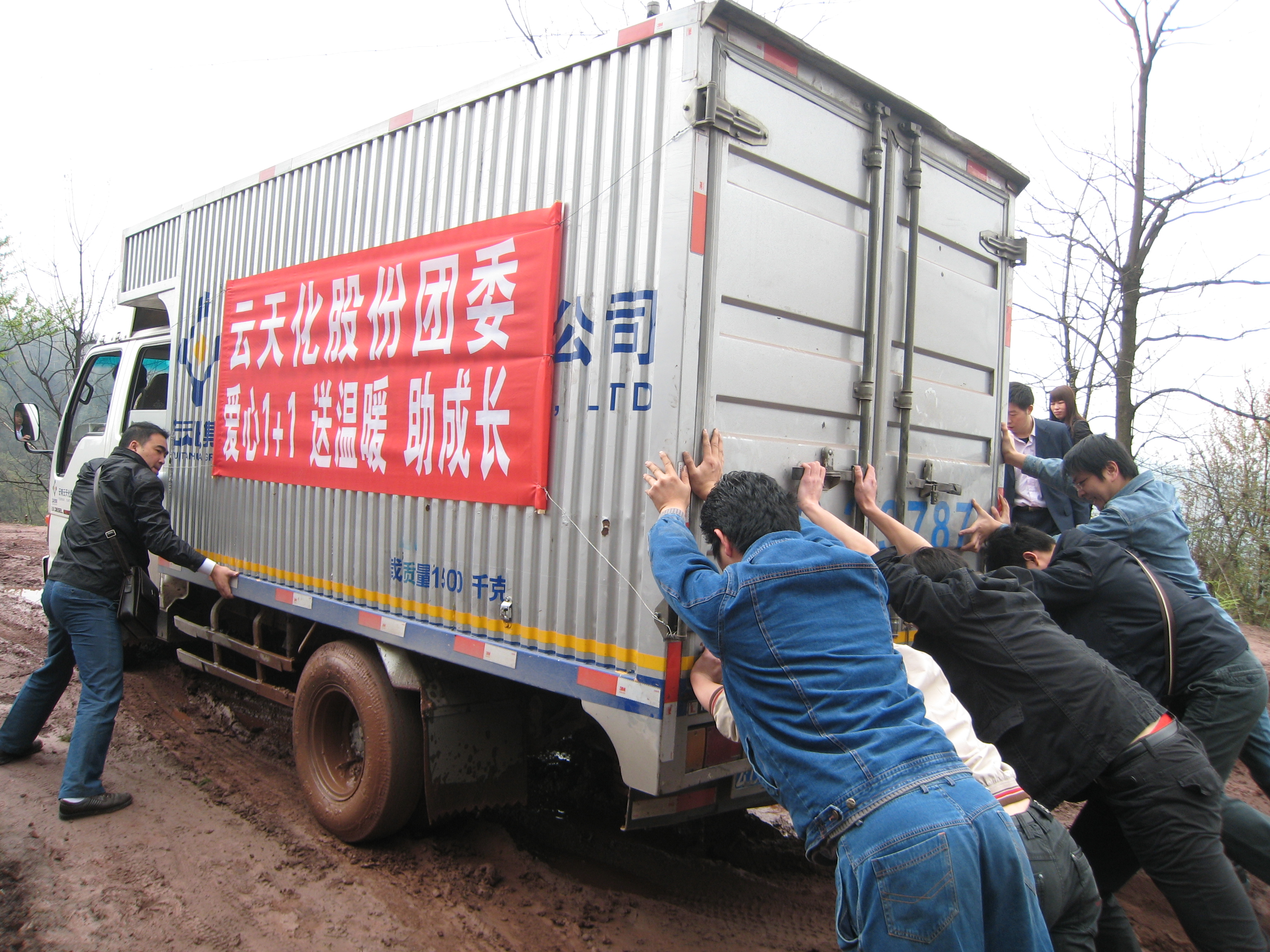 青年团干推深陷泥泞路的货车