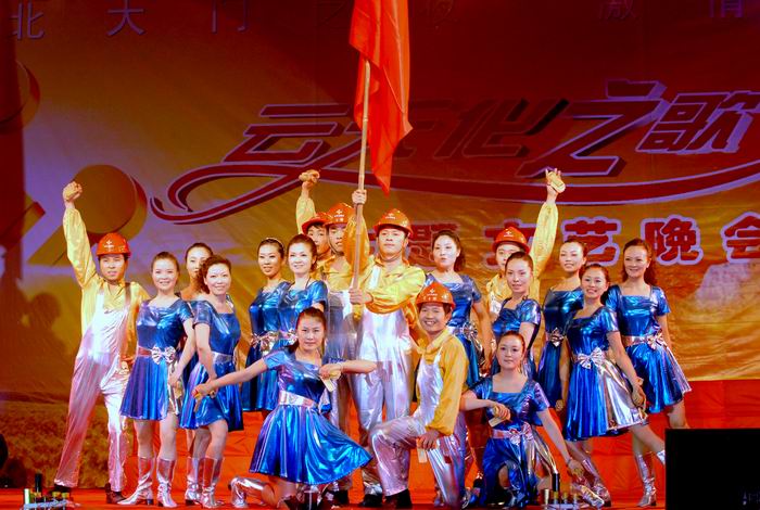 最后,在全体演员观众齐唱《咱们工人有力量》的合唱声中,晚会圆满结束。