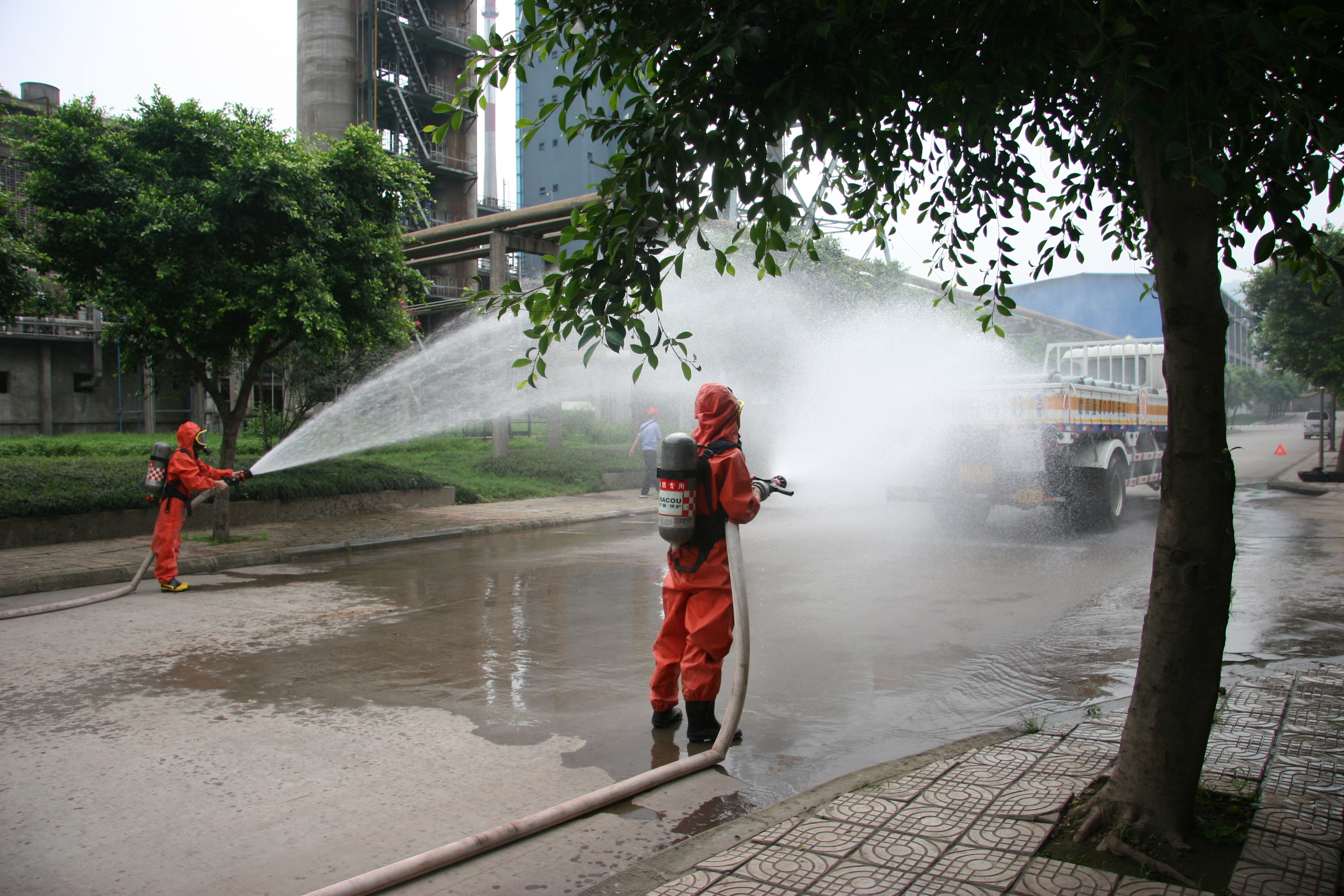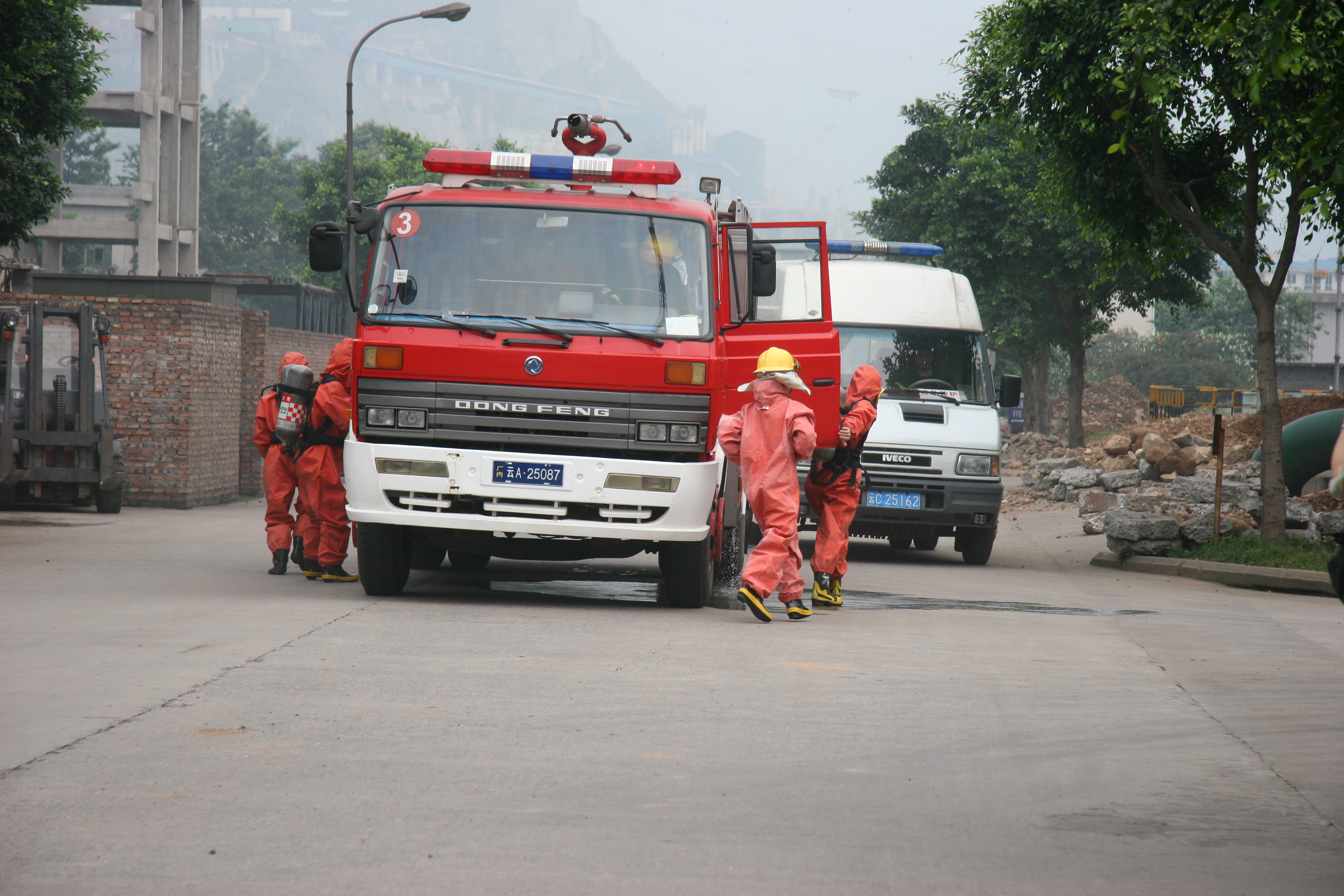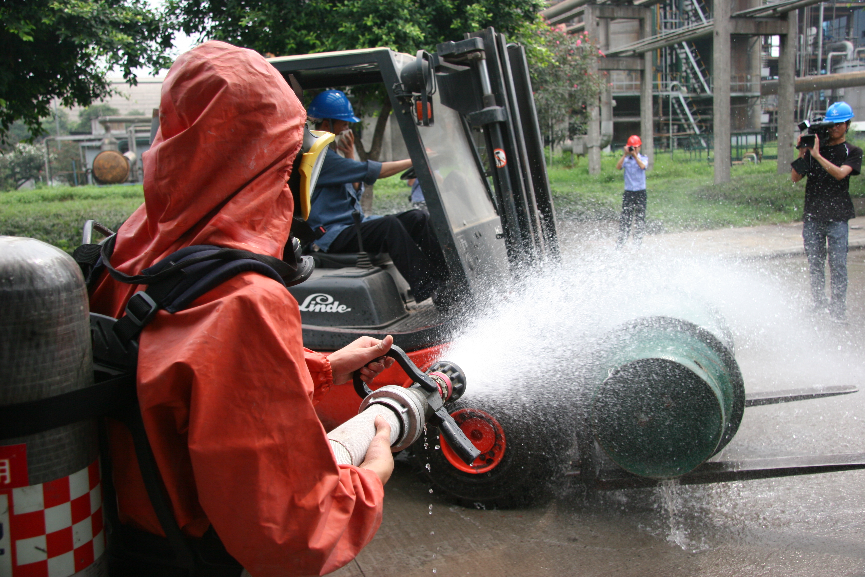接到报警后,消防队立即出动消防车、救护车各一辆赶赴现场。消防车用两支水枪对事故瓶进行稀释,掩护工作人员对事故瓶进行转移处理;救护车、消防救护人员则现场待命,已备抢险人员受伤时能及时施救。经过20分钟左右的处理,事故瓶被安全转移,10:47分现场清理完毕,人员撤离,演习圆满结束。