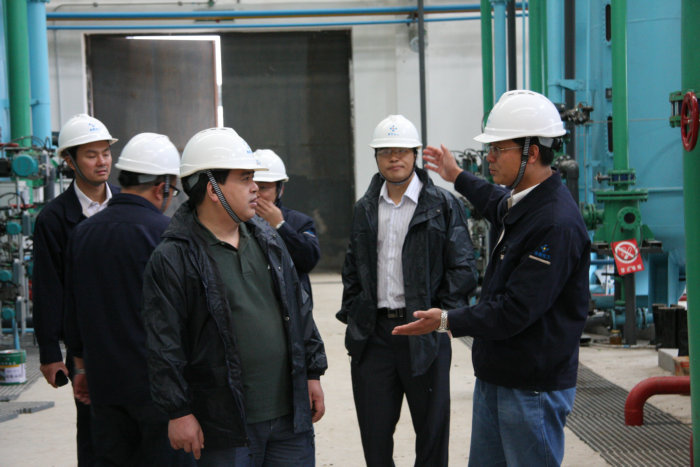 总经理刘和兴在金新化工脱盐水厂房了解试车情况