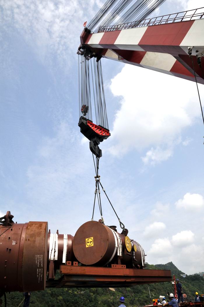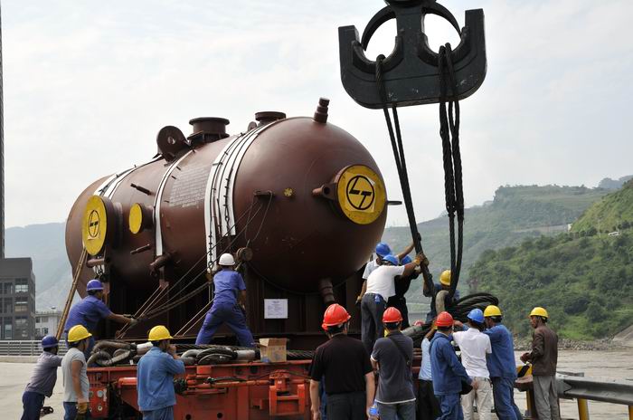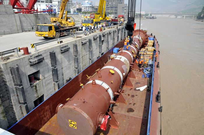 8月底,该气化核心设备就已陆续运抵水富港码头,但由于受汛期的影响,金沙江水流量过大,导致运输船只不能及时靠岸,转运工作一直无法开展。9月2日,金沙江水流量有所减缓,转运工作全面启动,经过一天的不懈努力,气体回流室和输气管于当天下午19:00转运至“煤代气”技改工程建设现场。9月3日,“煤代气”技改工程气化核心设备的另一关键组成部件合成器冷却器开始卸船。