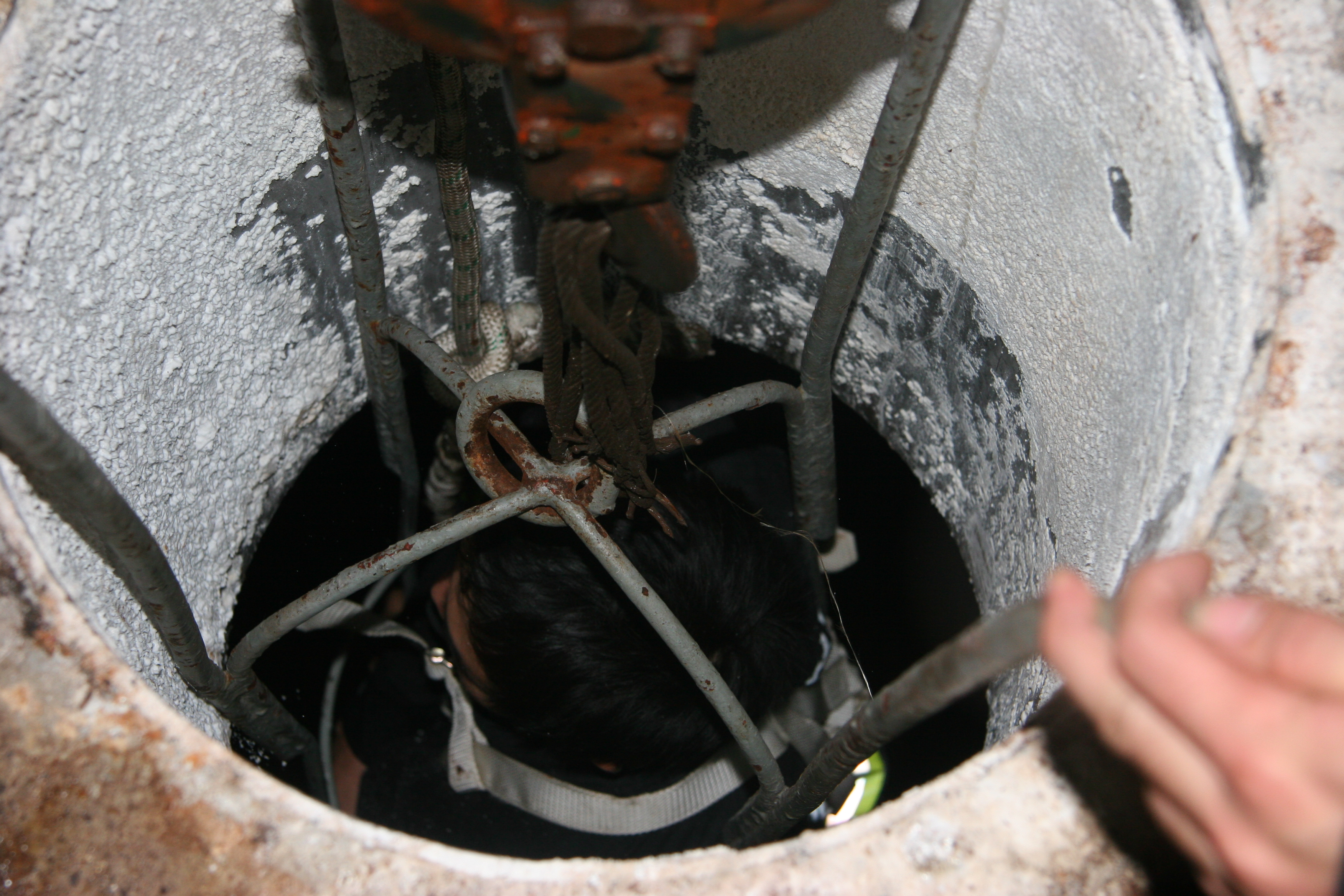 如果说塔壁的清洗是对消防队员体能和毅力的测试,那么接下来塔顶的清洗就更是对消防队员专业素养和胆识的考验。由于尿素造粒塔高达56米,中空的塔壁没有任何立足之地,消防队员们只有利用一支貌似吊篮的工具将一名体型相对瘦小的消防战士悬吊在内进行清洗作业。