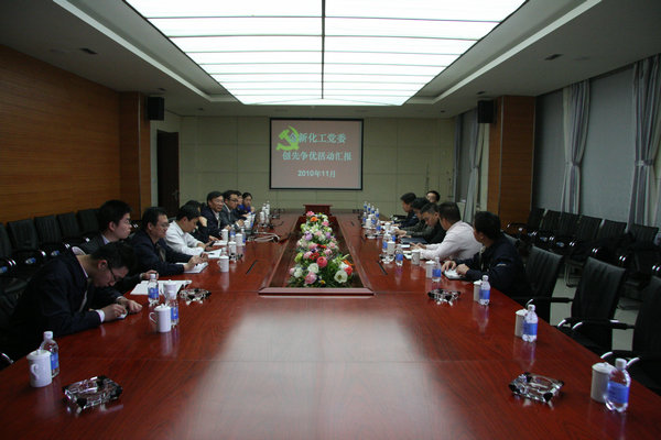 11月23日下午,股份公司总经理刘和兴在金新化工一会议室听取了创先争优活动的汇报,他充分肯定了金新化工的创先争优活动取得的效果,并对下一步的活动开展提出了要求。金新化工党委书记陈大文,党委委员、工会主席徐怀春,党委委员、纪委副书记简开忠及各党支部书记、创先争优活动办公室成员参加了会议。