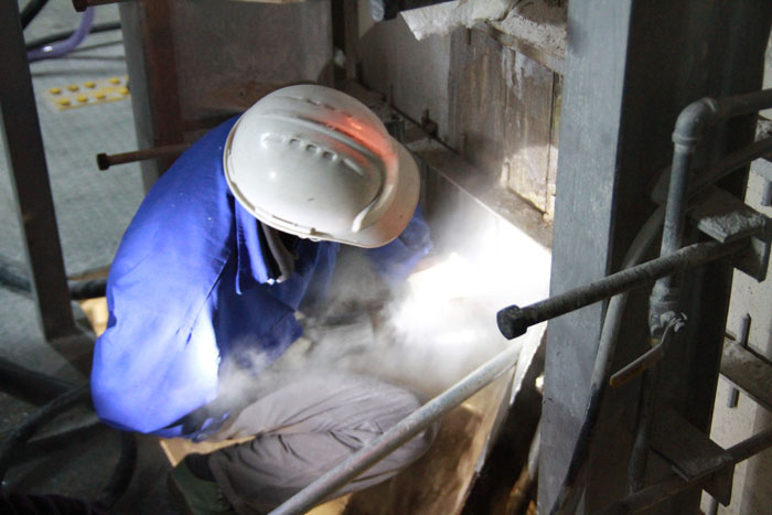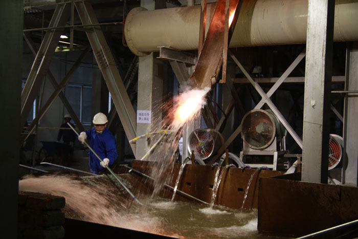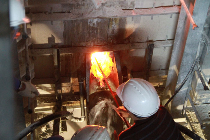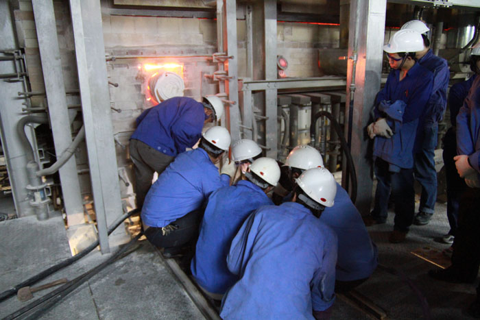 此次F02线池窑停炉冷修工作,公司高度重视,各项准备工作也做得十分充分,早在一个月前就制订了详细的实施方案,重点加强铂金漏板安保和人员、设备安全工作,并且组织员工进行了现场演练,确保停炉过程万无一失。23日14时,F02线已停止加料,并用保温棉堵住料口以防止玻璃液外流。24日凌晨4时-6时,基本准备工作就绪,上午9时,池窑水池放水,员工开始钻凿西面排料口,在一千多度的高温下,员工们不怕辛苦,轮流上阵。9 :33分,西面排料口正式打通,但是由于玻璃太黏,玻璃液流得并不顺畅,现场员工再次冒着高温进行扩大打凿,9:38分,排料口扩大打凿后,玻璃液开始顺利外流,一楼六名员工随时待命,废渣清理工作正式开始。