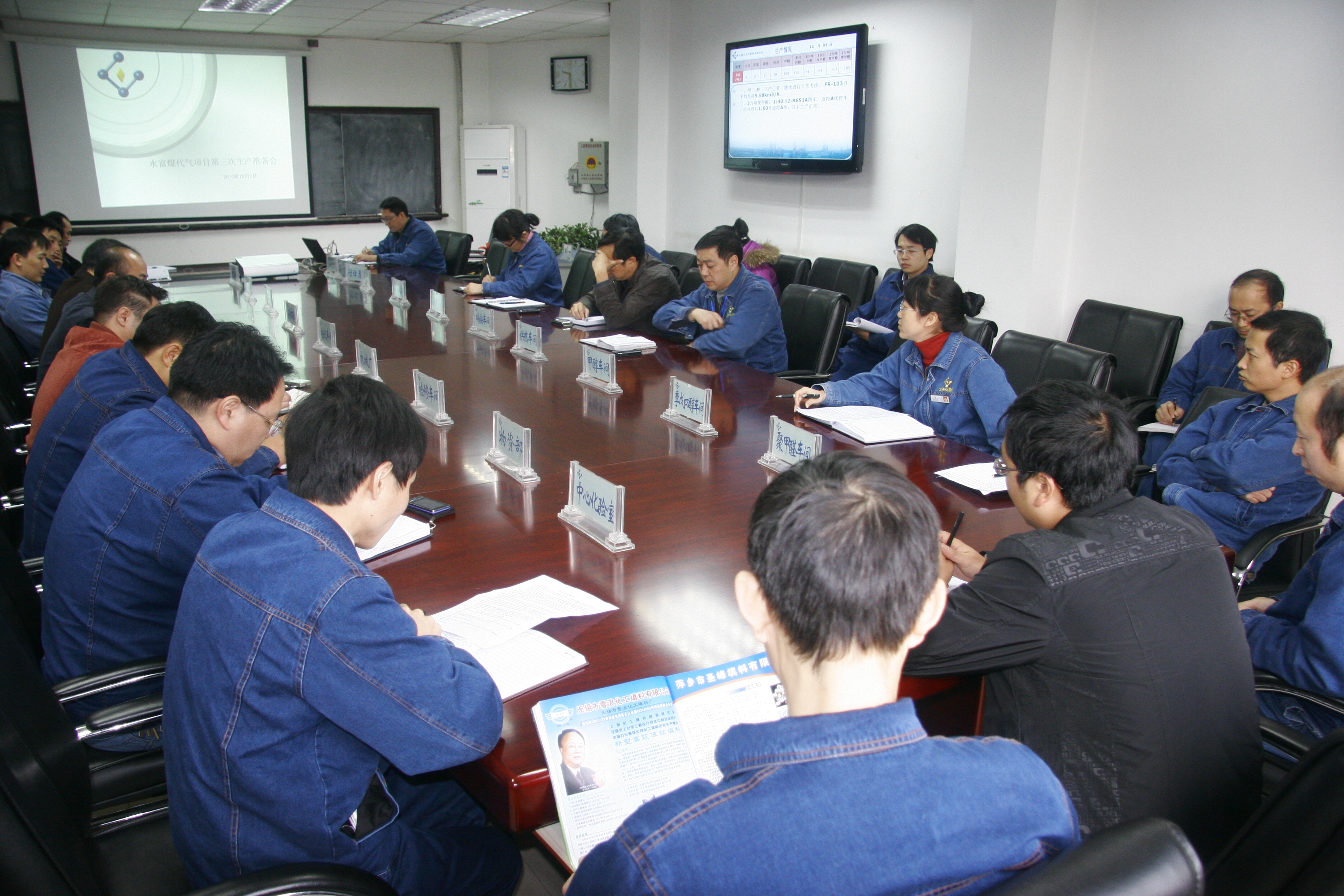 会上,生产部经理邓万明从技术准备、物资准备、管理标准 、存在的问题四个方面通报了公司煤代气技改项目目前的生产情况。随后甲醇、中化、检修、电仪、设备部、物资部等单位分别通报了各领域的技术准备、培训、物资准备情况。