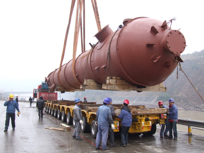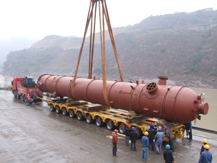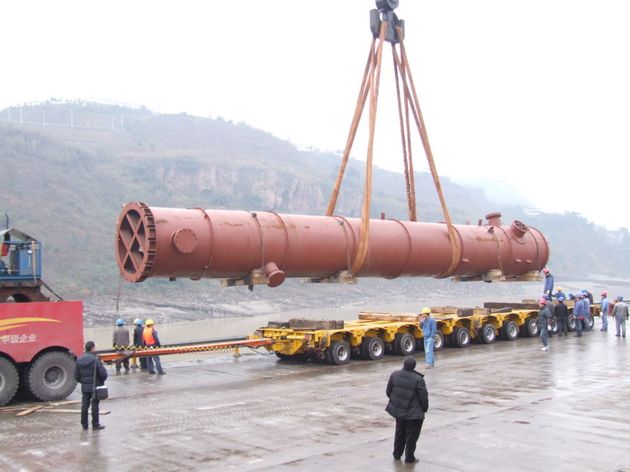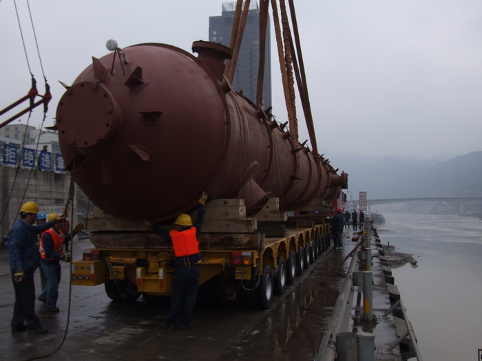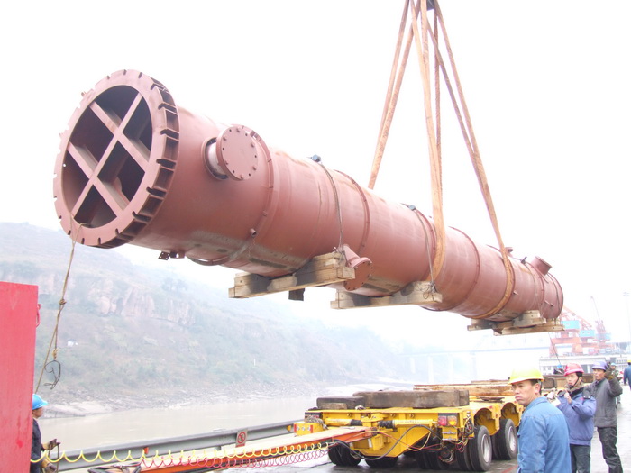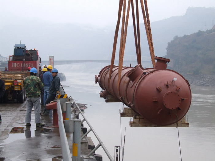 入塔气预热器E15401是煤代气技改项目甲醇系统中最重要的一台设备,长24米,重220吨,由四川科新机电股份有限公司制造。1月7日,E15401制造合格出厂,从什邡汽运至乐山码头装船,改水路于岷江顺流而下,经过8天的艰难航行,15日中午安全运抵水富码头。