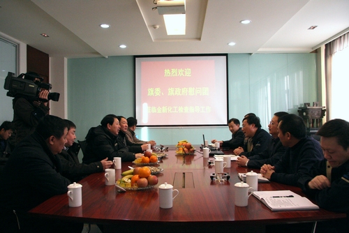 在办公楼二会议室,金新化工领导陈大文、林旭楠、李钢,以及行政、财务、运营部门领导与陈旗慰问团进行了座谈和交流。座谈会上,金新化工党委书记、总经理陈大文首先向旗委旗政府介绍了2010年公司项目建设进度和生产准备、装置试车等各项工作的完成情况,并围绕各装置的试车进度详细介绍了2011年的工作计划,同时对企业下步发展所面临的困难和问题向旗委旗政府进行了汇报。