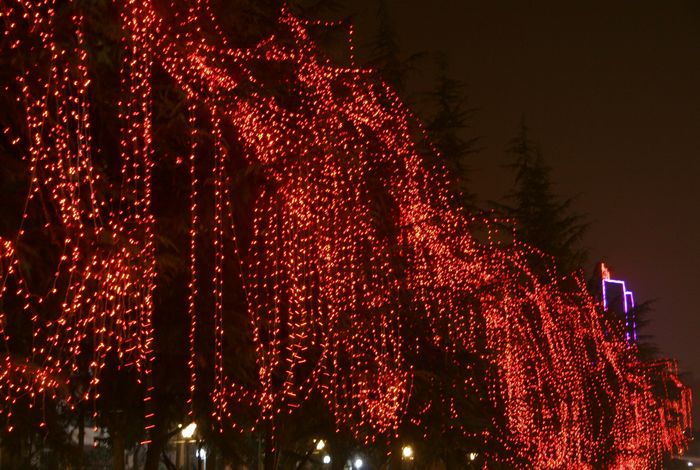 在去年的基础之上,今年无论从灯光的数量还是种类上较去年都有较大的改进,仅“LED满天星”灯珠就增加30万余颗,“流星雨”由去年的38根增加到了350根,新增“滴水灯”用于云天宾馆大门装饰;同时,灯光的颜色也变得更加丰富,由单一的白色变为红黄白蓝等多种光彩配合。灯景的布置区域和密度也有不同程度的增加,除在文化广场和1、2号门岗入口大道上进行灯光布置外,彩虹大道的雪松、灌木丛,新高楼的高山榕之上均挂有不同种类的彩灯。