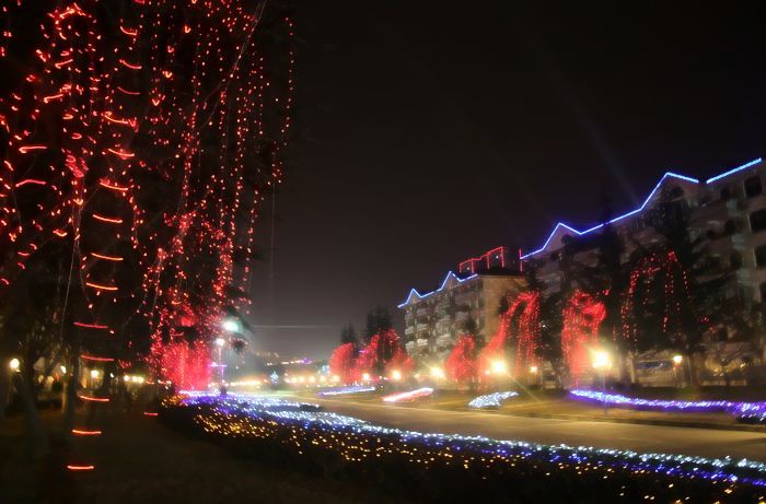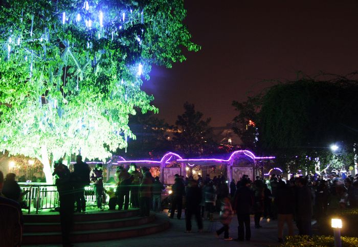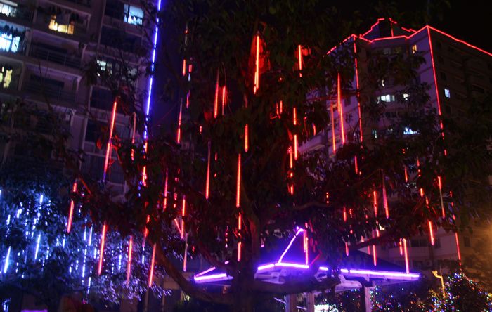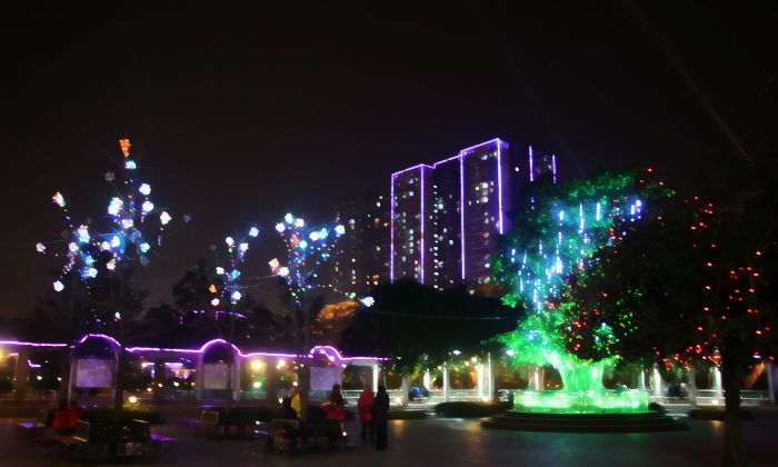 兔年春节的傍晚行走在云天小区,让人格外的舒适惬意。彩虹大道边上“火树”与传统的中国红相映衬,云天宾馆大门之上的“银花”闪烁欢迎着远道而来的宾客,草坪上的“玉兔”恭贺着新春佳节的到来,灌木丛上漂浮着“紫色丝带”给人一种朦胧之美,一、二号门岗内的直道上也是一片星星点点,五彩斑斓,文化广场和新高楼前的“许愿树”让小孩子呀呀直叫,嚷嚷着要去亲密接触坠落的灯光,车库的天窗也被装点为一排靓丽的“金字塔”,还有楼阁上的大红灯笼,高楼上的霓虹彩条,光影交加、错落有致。游园的人们放慢了步伐,有的专门拿着相机,也有的赶紧掏出手机,记录着这不眠之夜。