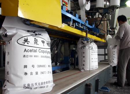 在确保装置稳定运行的同时,车间花大力气着力加强产品质量控制,通过对两套聚甲醛装置造粒工段摸索及真空管道和造粒机真空脱气口的改进,造粒运行周期可延长至30天以上,大大减少停车次数,稳定了产品质量。同时,加强对生产过程的监控,通过对造粒机的参数优化及粒料干燥系统操作细化和规范,使聚甲醛产品质量得到稳步提升,产品中黑点料大大减少;2010年11月,印有中国制造的M25“云天化”牌聚甲醛冲出国门赢得了海外市场订单,铸造了公司聚甲醛产品民族品牌形象,提升了“云天化”品牌影响力。同时水富基地1万吨装置是国内唯一一家能够生产M25牌号聚甲醛的厂家,目前云天化的产品品质已经得到了美国杜邦公司的认可。其出口聚甲醛产品牌号也已增加到了4种,包括M25、M120、M90和M270,产品先后出口欧洲、美洲、大洋洲及亚洲的30余个国家。