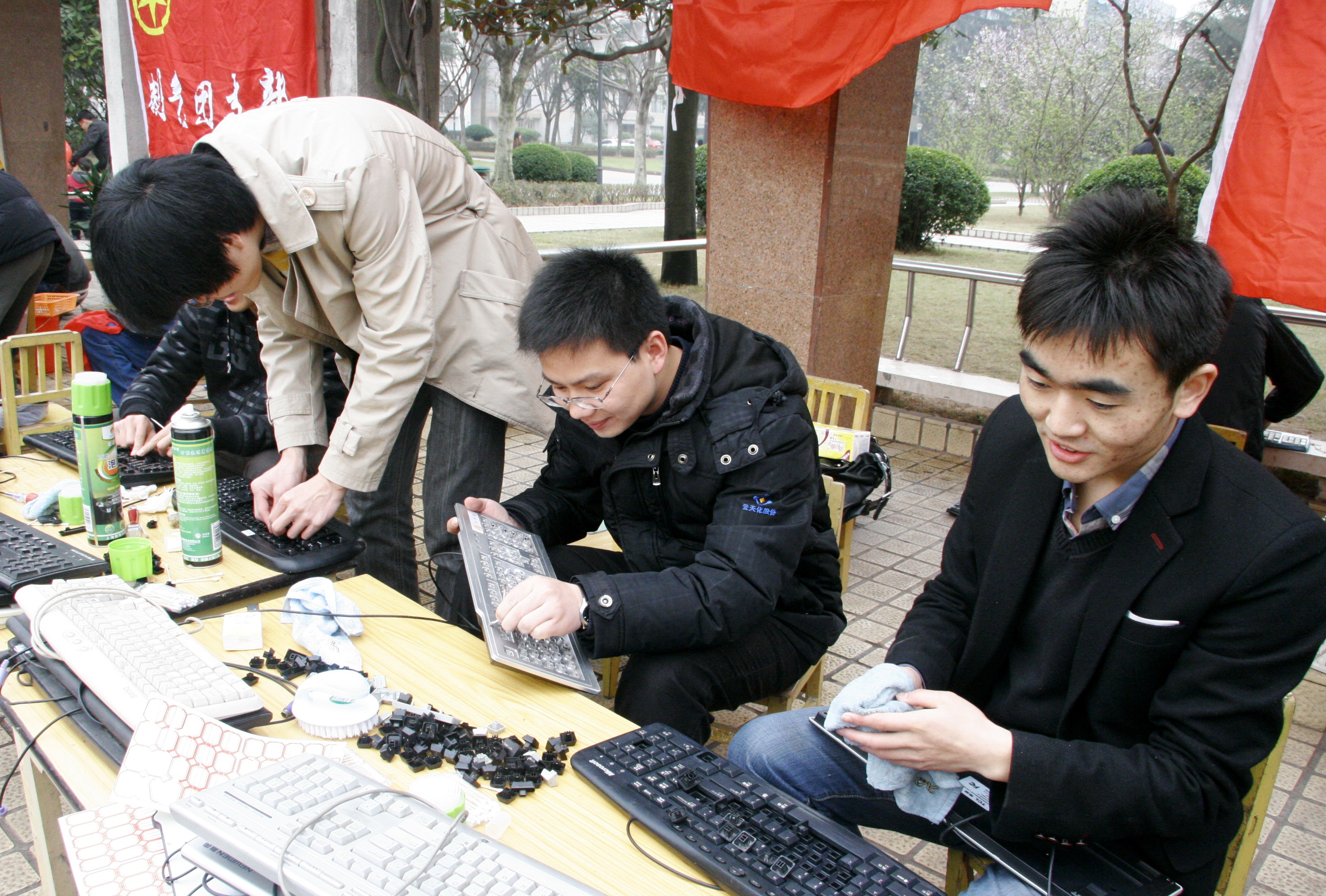 一大早,云天小区广场上就已是团旗招展、热闹非凡,青年志愿者们早已忙活开来,擦皮衣、洗键盘、义诊、洗眼镜、清洗手机,清洗健身器材、花卉义卖、发放环保袋、兑换零钞等多项活动区域都排起了长长的队伍。青年志愿者们个个忙得满头大汗,但他们的脸上却始终洋溢着会心的笑容。