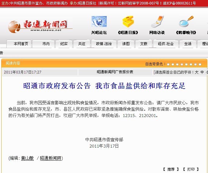 随后记者从有关部门获悉,云南省盐务部门和食用盐生产企业均表示,有足够的食用盐保障市场供应,现已经发出大批食用盐运送至各大售货点,满足需求,请广大消费者不必恐慌,以正常的状态保证工作和生活的运行。