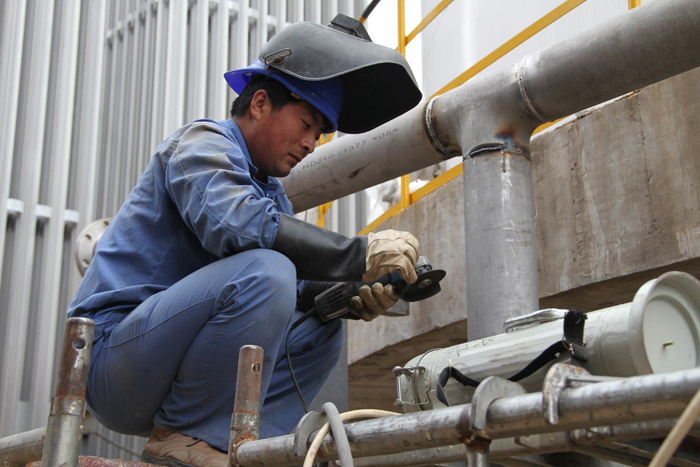 平时,我们看到项目建设的进度很快,从开始的土建工程到后面的装置、设备的安装都在火速推进,尤其是高达64米的分馏塔更是在短短两周时间就神奇般的矗立在长江边,成为了公司的地标性建筑。谈及这些,我们看到了公司项目负责人和施工方主管人员脸上自然了流露出了一丝疲惫的表情。我们了解到,根据CPIC的规划,F02线池窑重建改造工程将于6月上旬全部完工并点火投产,因此制氧站必须在这之前顺利完工并完成调试工作,生产出合格的纯氧保证F02线点火时能够正常使用。在这个巨大的挑战面前,CPIC相关领导通过积极和施工单位进行沟通和协调,制订了详细的施工进度方案,施工方也抽调了精干的工程技术人员全力以赴,分成多个专业施工组24小时轮班作业。近期在焊接管道和压力容器的时候,都是采取白天焊接,晚上探伤的方式,既缩短了工期,又有效保证了施工质量。
