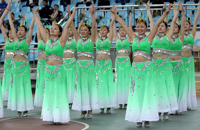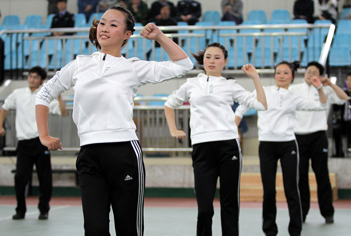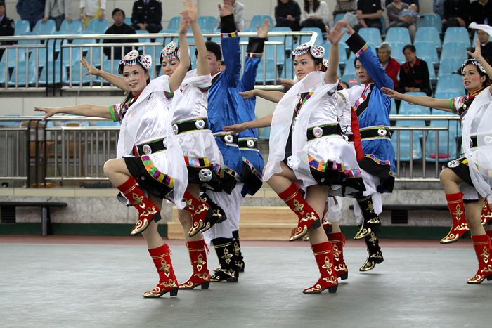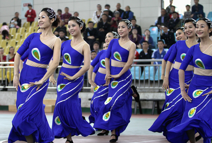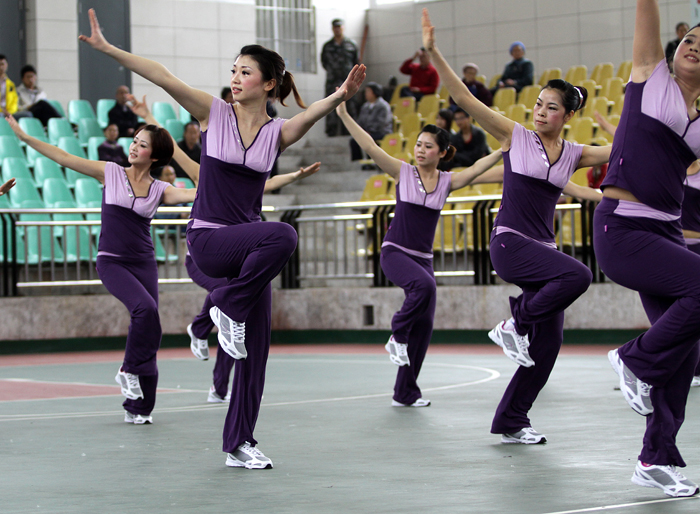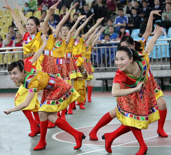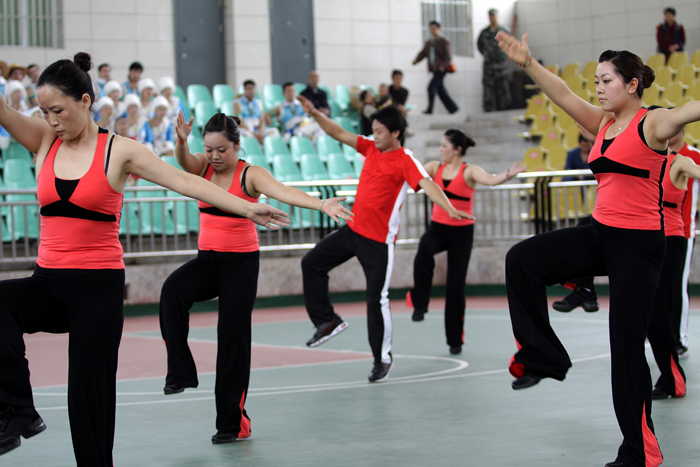 下午3点,比赛正式开始,17支参赛队身着整齐的服装陆续登场,豪迈的藏族健身舞、优美的傣族健身舞均充分融合了云南藏族、傣族舞蹈特色和现代健身操的节奏韵律,不仅节奏轻快而且姿态优美。