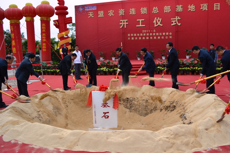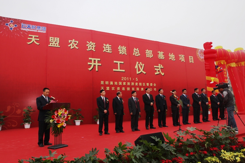 5月25日,海埂片区内紫云路以东,金柳路以北的一处施工现场灯笼高挂,礼炮齐鸣,天盟农资连锁有限责任公司新建办公楼奠基仪式在这里举行。昆明市市委书记仇和、昆明市政协主席田云翔、昆明市委常委、常务副市长李文荣、官渡区委书记保建彬、昆明市人大常务副主任宋黎明、滇池国家旅游度假区管委会主任、党工委书记罗建宾以及云天化集团有限责任公司董事长、党委书记董华、集团公司常务副总经理张嘉庆、集团副总经理胡均、股份公司副董事长、党委书记、天盟公司董事长刘富云、股份公司副总经理、天盟公司总经理吴长莹等一行参加了天盟公司新总部基地奠基仪式。