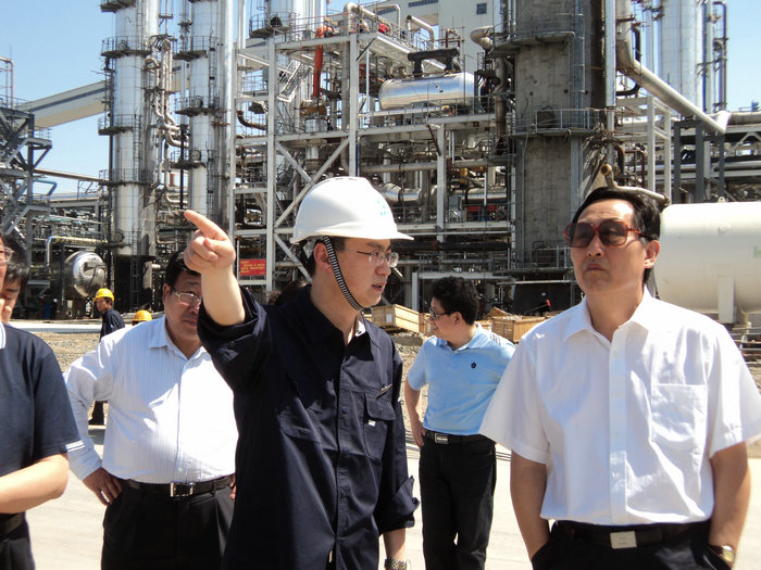 在金新化工厂门口巨幅广告牌前,营销总监叶川彬简要介绍了金新化工项目建设投资方、工艺选型等基本情况。随后,中央纪委驻商务部纪检组组长王和民一行驱车了解了项目建设现场情况,在金新化工合成装置主席塔前,中央纪委驻商务部纪检组组长王和民听取了金新化工营销总监叶川彬关于施工及试生产情况的介绍。