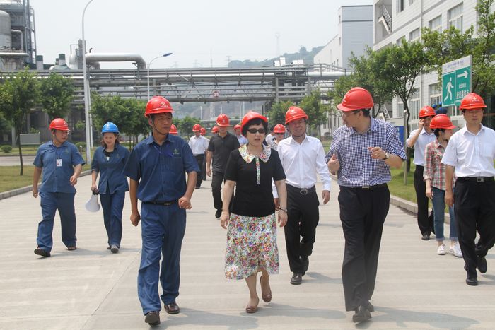 随后,重庆分公司总经理张玉杰,副总经理贾旭东、陈东等陪同童小平副市长参观了生产现场。在主控室里,总经理张玉杰就视频监控系统运行情况、装置生产运行情况等向童小平副市长作了介绍。在产品包装工段,童小平副市长还查看了聚甲醛产品质量情况,并对聚甲醛产品市场、用途等作了了解。
