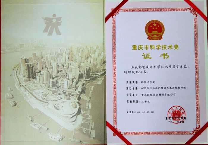 7月19日,2010年度重庆市科学技术奖励大会在重庆市委礼堂隆重召开,大会表彰为重庆市科技事业和现代化建设做出贡献的科技工作者,CPIC开发的“耐汽车冷冻液的增强尼龙用短切纤维”项目喜获重庆市科技进步二等奖。