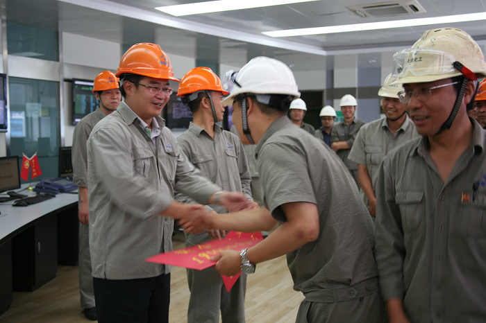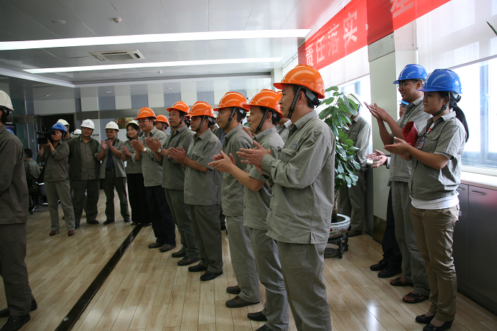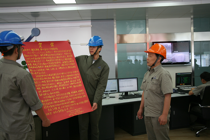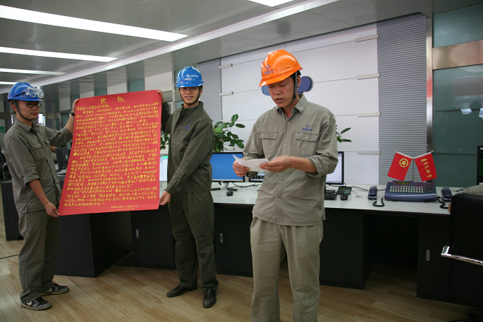 精益生产结硕果,锣鼓声声捷报传。当天13时30分,祝捷队伍敲锣打鼓从天安化工办公楼整装齐发,前往生产区。在中央控制楼二楼主控室,天安化工生产部经理刘强首先报捷,公司副总经理张元梁代表公司宣读贺信,公司副总经理、工会主席向建刚宣读了股份公司贺信。天安化工总经理、党委副书记江凌,党委书记、副总经理罗秀祥,副总经理黄天江分别向制气、合成、热电车间代表握手表示祝贺并颁发奖金。现场响起阵阵热烈的掌声,欣喜和激动溢于言表。