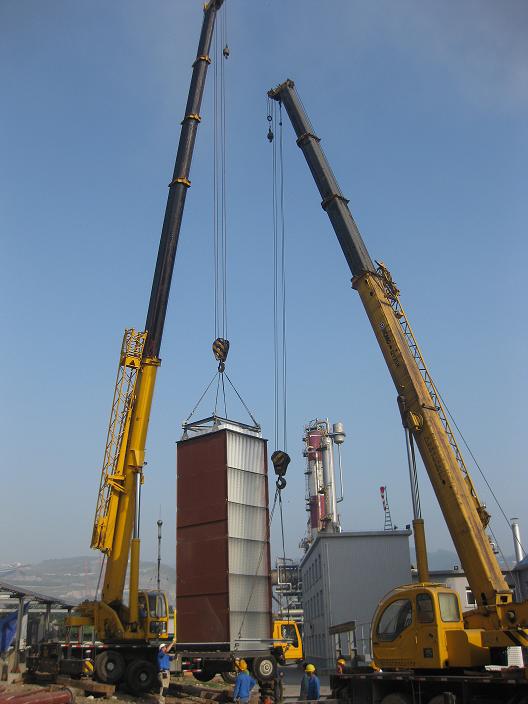 由于现场场地空间有限,为了确保安装工作的顺利进行,煤化工指挥部和施工单位未雨绸缪,提前准备,制定了严谨而详细的吊装方案。8月18日上午9时许,随着65吨主吊车的启动,WSA冷凝器内件缓缓升起,25吨吊车紧随其后进行遛尾,经过一个小时的定位和调整,第一个模块顺利吊入冷凝器外壳之内。随之在上午11点半,第二个模块也顺利吊入。
