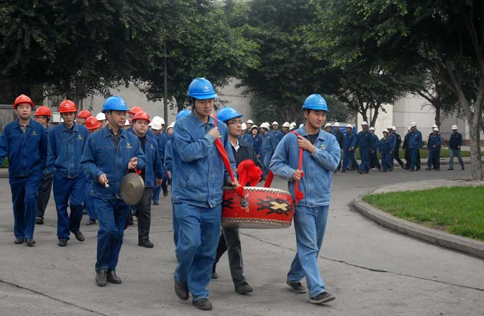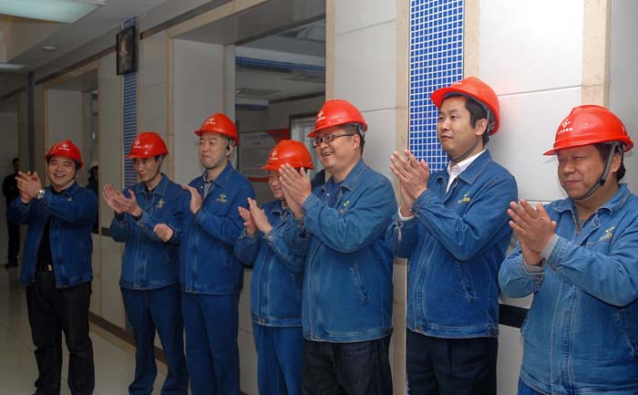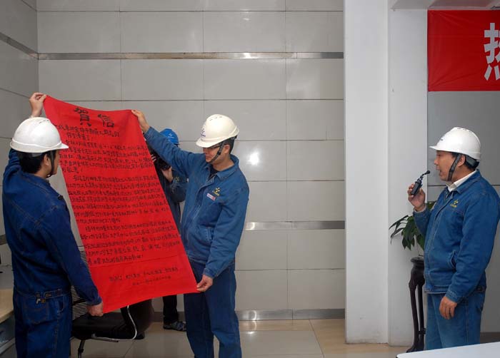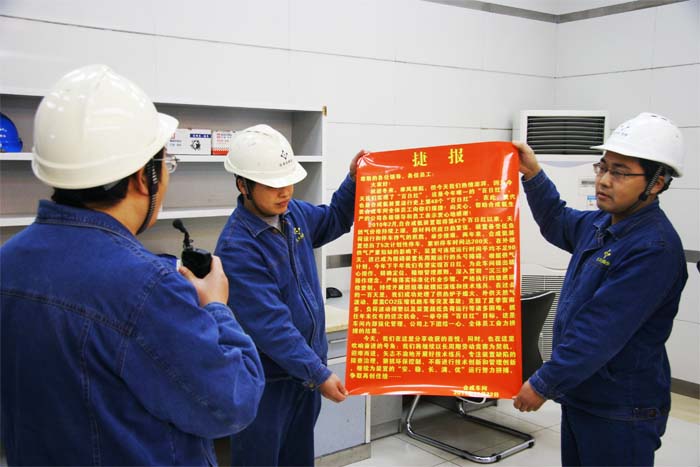 早上9点30分,在一片欢快的锣鼓声中,公司领导刘和兴、刘富云、陈林、梁洪、冯驰,总经理助理曾家其以及副总工程师带领着职能部门、生产、辅助车间负责人,喜气洋洋地从公司大门出发,前往合成主控室祝捷。