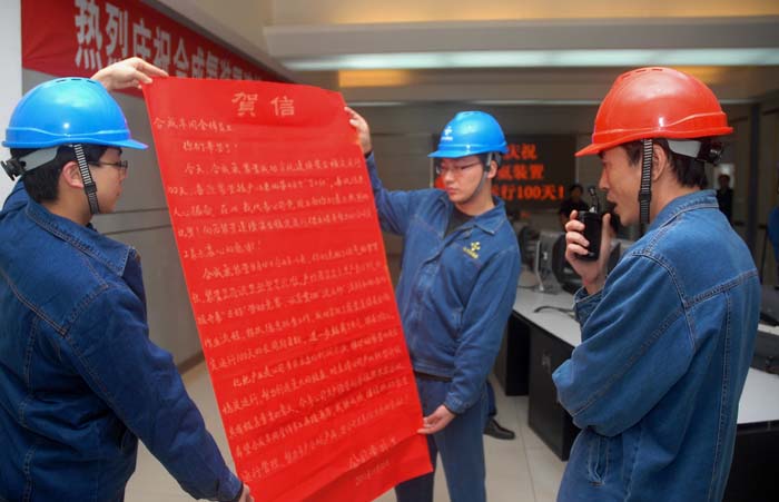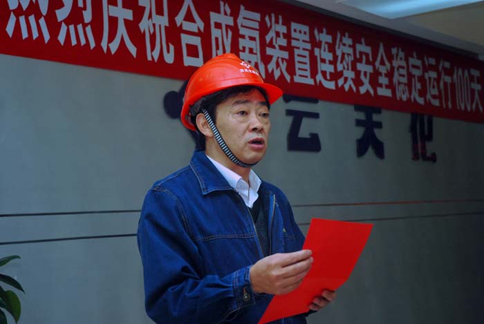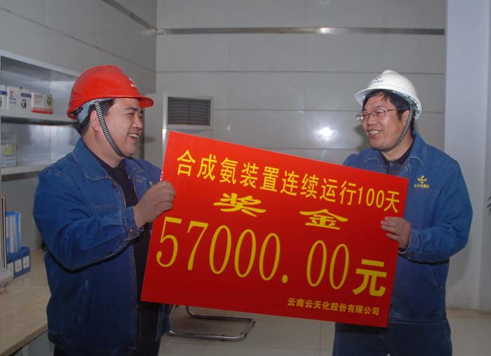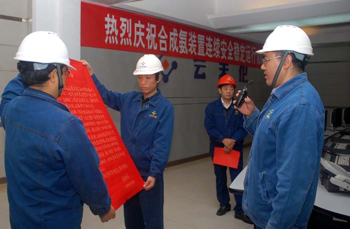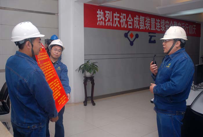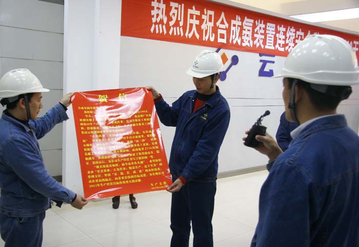 2011年11月22日,合成氨装置连续安全运行达到100天,实现了公司2011年的首个百日红。由于天然气持续供应紧张,这个百日红显得弥足珍贵,公司上下欢心鼓舞共同前往合成车间祝贺。
