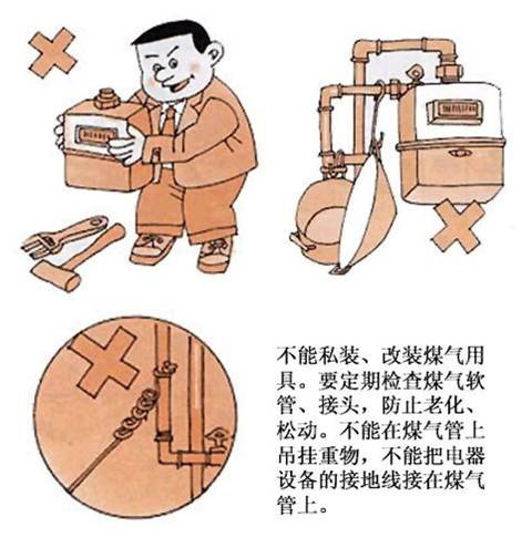 2、不能私装、改装煤气用具,要定期检查煤气软管、接头、防止老化、松动。不能在煤气管上吊挂重物,不能把电器设备的接地线接在煤气管上。