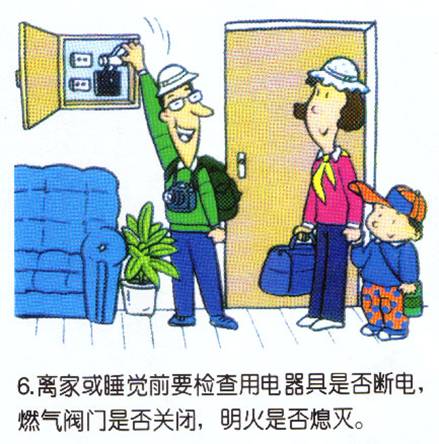 5、离家或者睡觉前要检查用电器具是否断电、燃气阀门是否关闭,明火是否熄灭。