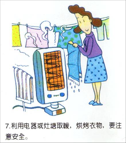 6、利用电器或灶膛取暖、烘烤衣服要注意安全。