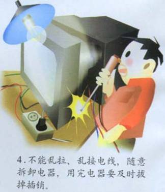 7、不能乱拉、乱接电线、随意拆卸电器,用完电器要及时拔掉插销。